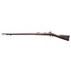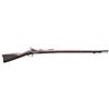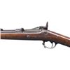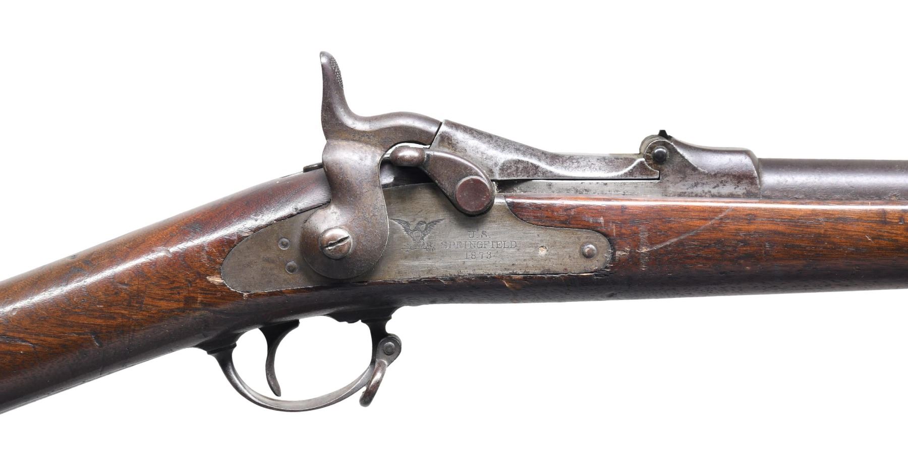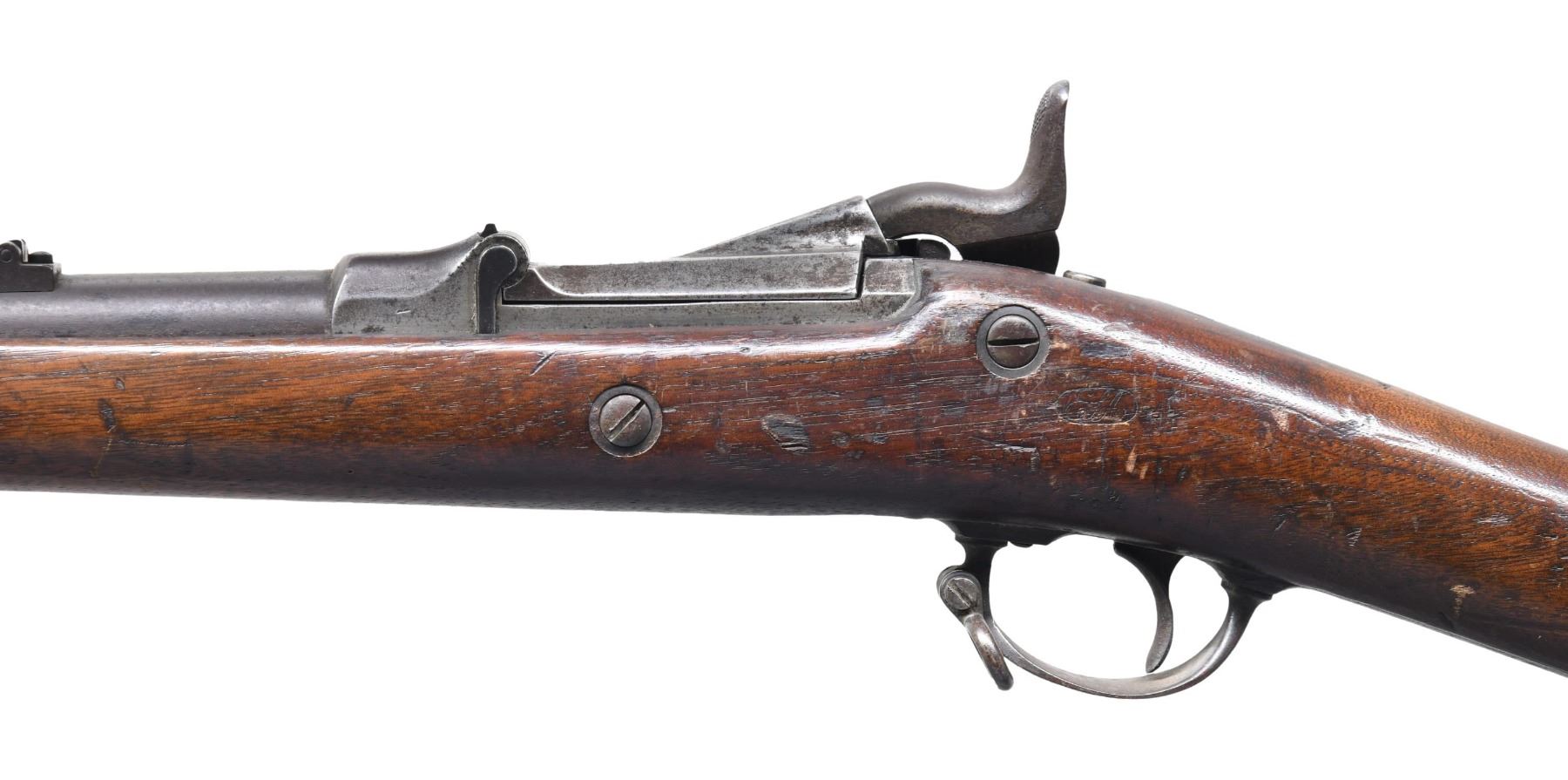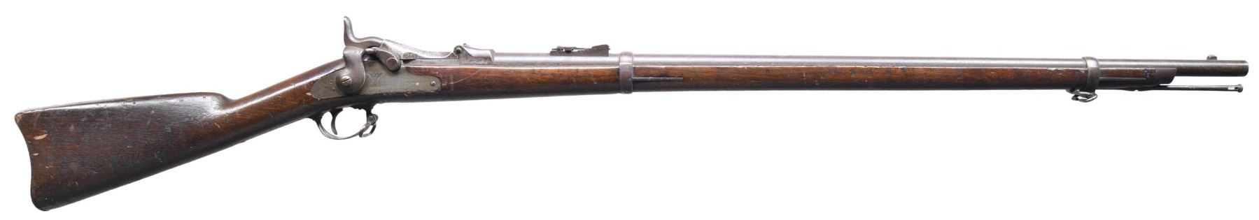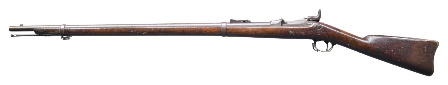 RIFLE. Cal. 45-70. S# 54190. Bbl. 32 5/8". Fixed front sight with Model 1873 rifle rear sight. "1873" dated high arch breechblock with "1873" dated Springfield marked lockplate. 2-band fastened walnut stock with iron fittings and slotted tip ramrod. Left side of stock has "ESA" cartouche. CONDITION: bbl. finish has faded to brown showing surface corrosion and spots of light pitting. Action and lock have gray/brown appearance with spots of pitting and evidence of cleaning. Stock has age darkened worn appearance with numerous scratches, marks, and dents. Functioning lock and action with replacement brass firing pin. Pitted bore retains largely intact rifling. (01-27231/DS). ANTIQUE. $400-600.