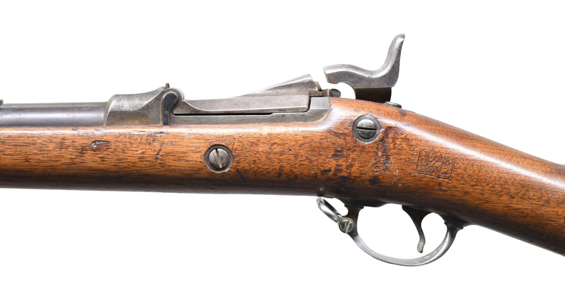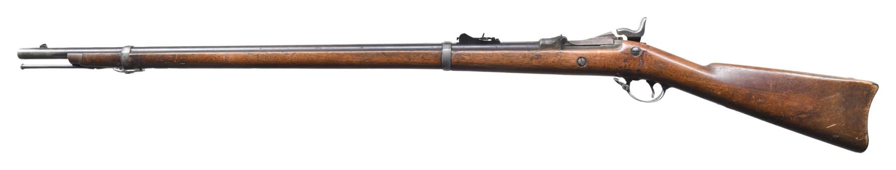 RIFLE. Cal. 45-70. S# 259256. Bbl. 32 5/8". Pinned blade front sight with graduated leaf rifle rear sight. "1873" dated breechblock with Springfield marked lock. 2-band walnut stock with button tipped ramrod and iron fittings. Left ear of stock has a visible "SWP" cartouche with "1884" date. CONDITION: metal is fading to a mottled brown/gray showing spotted surface corrosion. Wood has aged worn appearance with numerous scratches, marks, and small dents. Sound lock and action. Bore is generally bright with sound rifling showing spots of pitting. (01-27229/DS). ANTIQUE. $600-900.