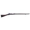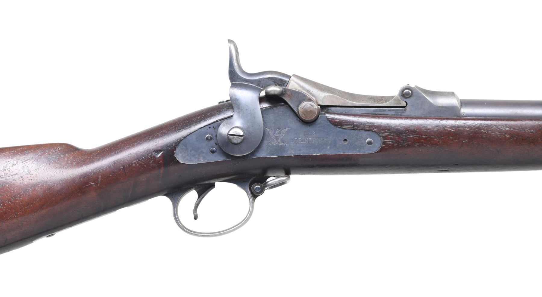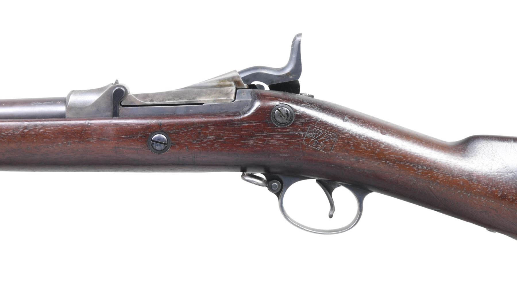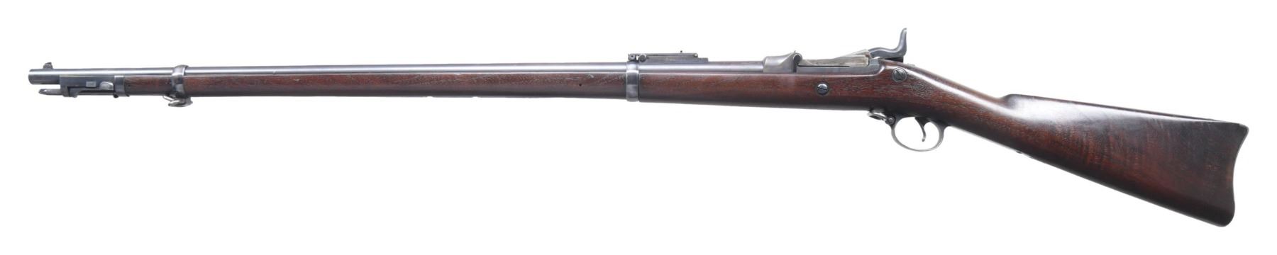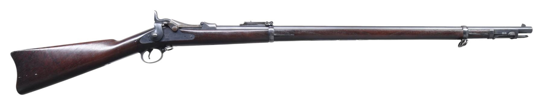 SINGLE SHOT TRAPDOOR RIFLE. Cal. 45-70. S# 527109. Bbl. 32 5/8" Fixed front sight with Model 1884 Buffington rear sight. "1884" dated case colored breechblock with blued Springfield marked lock. Band fastened stock with iron fittings and standard issue ramrod-bayonet. Left ear of stock has clear "SWP" cartouche with "1891" date. CONDITION: very good retaining over 70% lightly faded original blue. Breechblock has traces of case colors. Original stock finish shows light wear with scratches and marks. Sound lock and action. Bore is generally bright with strong rifling showing small spots of very light pitting. (01-27228/DS). ANTIQUE. $800-1,200.