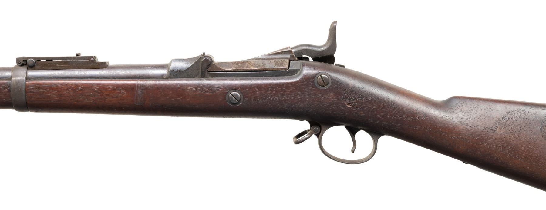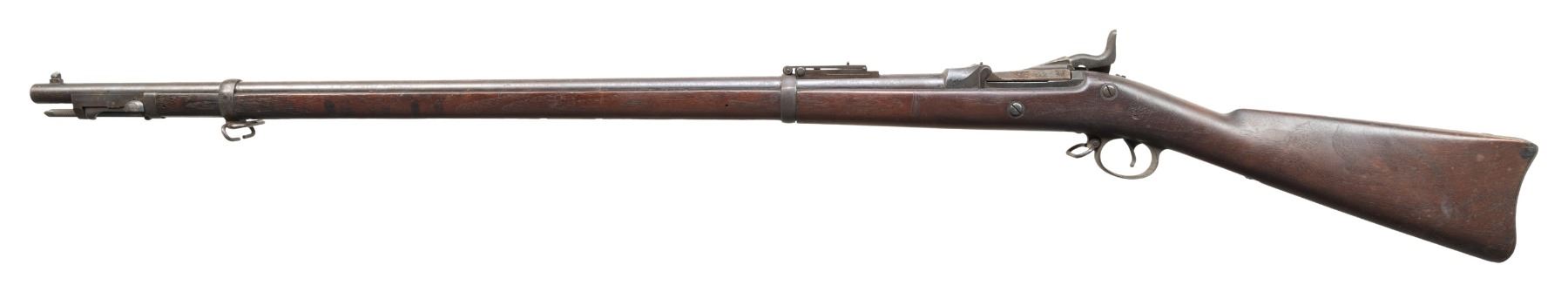 MILITARY RIFLE. Cal. 45-70. S# 518311. Bbl. 32 1/2". Barrel is marked on top over chamber with "I" and marked on the left side with "V / P / eagle's head / P". "R" marked Buffington ladder rear sight graduated to 2,000 yards. Blade front sight. Blade has been modified with solder to increase the height. The 1888 rifles are referred to as Rod Bayonet Springfields as the cleaning rod is configured to serve as a combination cleaning rod and bayonet. This rifle manufactured in 1891 carries its crisp boxed "SWP 1891" acceptance mark on the left side of stock and the encircled script "P" proof behind trigger guard tang. The rod bayonet is carried underneath the barrel and measures 35 1/2" overall. Breech block is marked "U.S. / MODEL / 1884". Lockplate has the spread wing "eagle" and "U.S. SPRINGFIELD" Three click tumbler. Two band walnut stock. Both bands carry stacking swivels. One piece trigger guard. Buttplate marked "U.S. CONDITION: stock has a moderately worn original finish with the scattered scratches and handling marks expected in a service rifle. Metal turning gray and patina with extensive areas of light oxidation and very fine pitting. Bore has strong sharp lands with a lightly frosted appearance throughout. PROVENANCE: Estate of Groves Herrick. (01-28769/RW). ANTIQUE. $400-600.