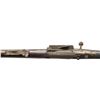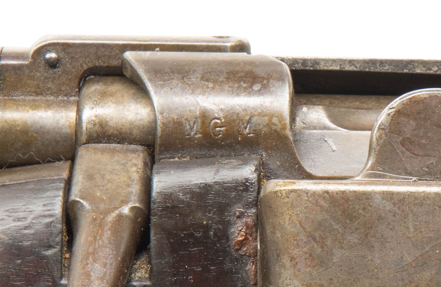 STUDIO MARKED RIFLE. Cal. 30-40 Krag. S# 300131. Bbl. 30". In addition to the standard receiver markings, the receiver is marked on the right side "MGM" and on the left side "37 K". Rifle appears to be otherwise unmodified. Model 1902 rear sight with sliding peep. Blade front sight. Walnut stock with smooth buttplate. UNATTACHED ACCESSORIES: brass muzzle cover / sight protector. CONDITION: stock set shows extensive wear with repaired and unrepaired cracks. Buttstock has extensive cracks with doweled repair. Stock set has appearance of having an arsenal rework finish. Metal turning gray and patina. Front sight is notably damaged. Bore is shiny with light frosting and lightly worn lands. PROVENANCE: From the PMRB Collection. (25-5845/RW). CURIO. $500-700.