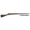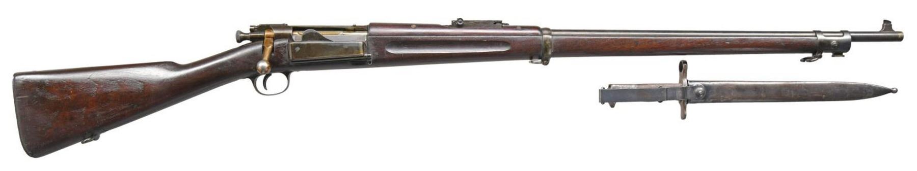 MILITARY RIFLE POSSIBLY USED BY CO. G 40TH U.S.V. IN PHILIPPINE INSURRECTION. Cal. 30-40 Krag. S# 217567. Bbl. 30". Model 1901 Ladder rear sight w/ windage adjustment. Blade front sight. Walnut stock and handguard. Stock has encircled script "P" and "32" assembly number under grip. Stock has an added marking on the left rear of butt the outline resembles a leaf and it encloses "US and 8". UNATTACHED ACCESSORIES: 11 3/4" fullered blade Krag bayonet dated on left ricasso "1898" and marked "US" on the right. Smooth walnut grips. Steel scabbard with wire belt attachment. Bayonet blade has scattered areas of light oxidation and very light pitting. Balance of metal turning gray and patina. Grips have light wear and staining. Blued scabbard turning patina with small dents. Consignor supplied document containing information from Springfield Research Service: "Serial Numbers of U.S. Martial Arms. Vol. 2" (pg. 75) stating that these rifles serial # falls within the range of a block of rifles sent to Co. G 40th U.S. Volunteers (Kansas) in 1899. The 40th U.S. Volunteers served in the Southern Philippines. "During the Spanish-American War, U.S. forces in the Philippines and Filipino forces led by revolutionary leader Emilio Aguinaldo had a common enemy in Spain. As hostilities came to a close the United States emerged from the war victorious. As a result of the Treaty of Paris, December 10,1898, the United States gained the Philippines as a U.S. territory. Approximately 125,000 troops served in the Philippines during the war. After more than three years of fighting, at a cost of 400 million dollars and approximately 4,200 American dead and 2,900 wounded, President Theodore Roosevelt proclaimed an end to the insurrection in the Philippines on July 4, 1902." CONDITION: Arsenal replacement stock has a nice appearance with crisp proof, light wear and small scattered handling marks. Metal has 60% of its original blue with thinning, wear, and scattered spots of light oxidation throughout. Action area has added varnish like protective finish. Bore is turning gray with fine pitting and light wear to lands. (23-2726/RW). CURIO. $1,200-1,800.