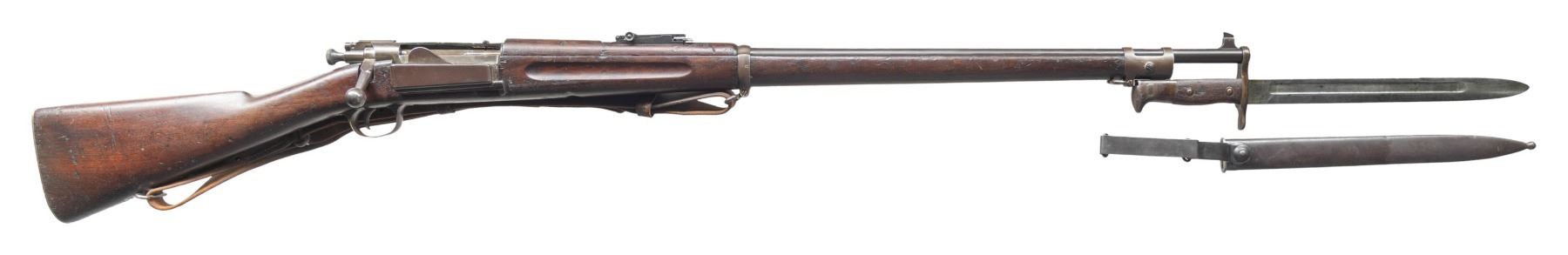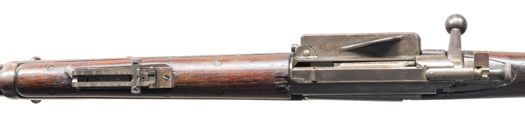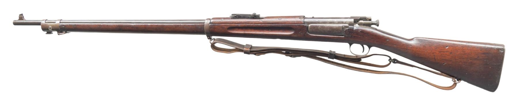 MARKED KRAG BOLT ACTION MILITARY RIFLE. Cal. 30-40 Krag. S# 428961. Bbl. 30". Buttplate is marked on top of tang "N.J". Additionally marked on top of stock ahead of buttplate tang "2" rack number. Model 1901 type 2 carbine rear sight w/ the added leaf spring between the upper & lower bases. Ladder type sight graduated to 2,800 yards. Blade front sight. Walnut stock set. Stock is marked on the left side w/ boxed "JSA 1903" acceptance mark & encircled script "P" proof under grip. Mag. cutoff is not present. Brown leather Model 1907 type sling w/ two brass hooks appears unmarked. UNATTACHED ACCESSORIES: 11 1/2" fullered blade bayonet. Marked on left ricasso "1900". Marked on right ricasso "US". Smooth walnut grips retained by two rivets. Bayonet is additionally marked on the left side of the pommel "92". Blued steel scabbard w/ Phelps type belt hook. Bayonet has worn blade, turning gray w/ spots of light oxidation. Grips have wear & staining throughout. Scabbard retains 50% of its original blue w/ wear, small dents & light oxidation. CONDITION: stock set has moderate wear, staining & handling marks throughout. Notable dents in bottom of forend below grasping grooves. Handguard has notable missing chips on the top left rear & crack extending between the rear of the handguard & the rear sight opening. Metal retains 50% original blue, turning gray w/ wear. Bore has worn lands, turning dark in the grooves w/ scattered pitting throughout. (25-2789/RW). CURIO. $500-800.
