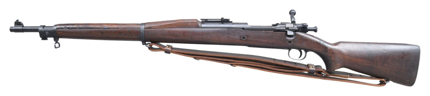 Cal. 30-06. S# 890042. Bbl. 24". Replacement bbl. marked behind front sight "HS / flaming bomb / 9 44". Ladder rear sight graduated to 2,850 yards. Sight ladder & movable base marked "R". Rear sight fixed base is Remington manufacture w/o lightening cuts. Blade front sight. Bolt is marked on top "B2". Striker assembly is Remington marked Model 03A3. Receiver has Hatcher hole. All milled furniture including smooth trap buttplate. Walnut stock set. C type buttstock w/ two recoil bolts. Stock is marked w/ "5" at end of pistol grip, matching "0042" serial number on right side of butt & marked "K" in cutoff recess. Handguard is late-war replacement. Brown leather turner saddlery Model 1907 type sling. Sling is in very good condition. UNATTACHED ACCESSORIES: plastic oiler in butt. CONDITION: stock set has moderate wears, staining & handling marks throughout. Handguard shows coarse wartime finish. Metal retains nearly all of its arsenal rework black Parkerized finish. Very good shiny bore w/ sharp lands. (25-3864/RW). CURIO. $400-600.