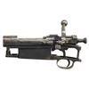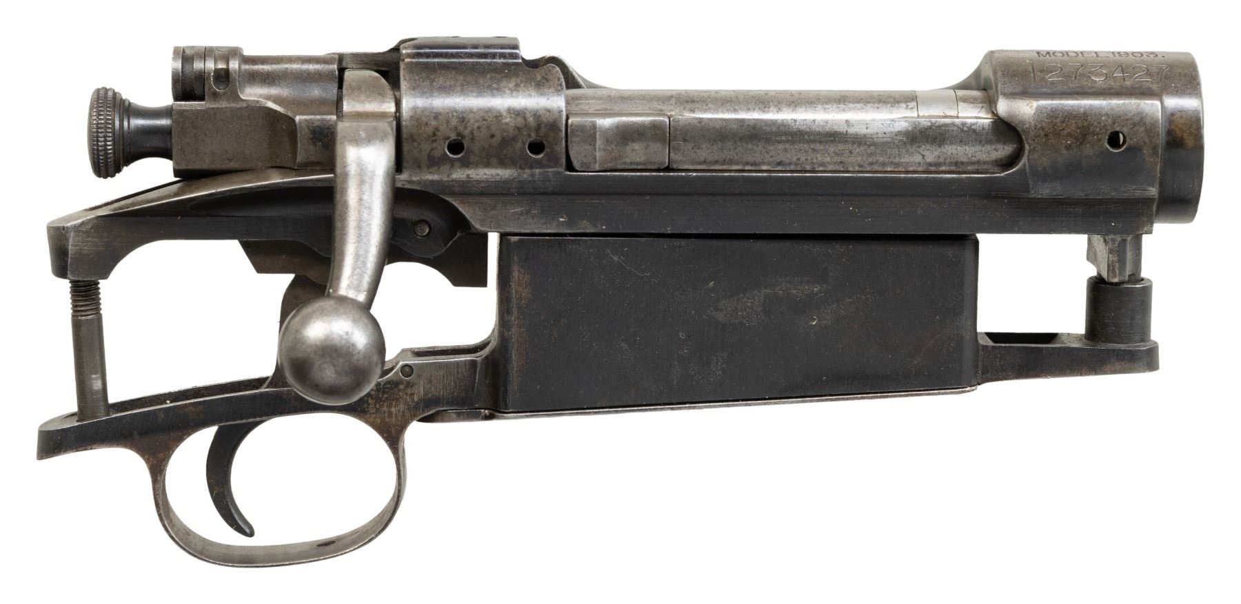 S# 1273427. Complete Model 1903 Springfield action. Receiver produced in 1926. Does not have Hatcher hole. Receiver bridge is drilled on top with two scope holes and drilled on the side with two holes for receiver sight. Bolt with swept handle is marked on top "J3". Cutoff assembly is present. Smooth trigger. Milled trigger guard assembly. Milled follower has been modified to allow bolt to close when empty. Trigger guard has holes drilled through the bow and in-front of trigger for unknown purpose. Guard screws are present. CONDITION: entire barreled action turning gray with areas of original worn blue finish with spots of light oxidation. (25-3122/RW). MODERN. $100-200.