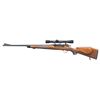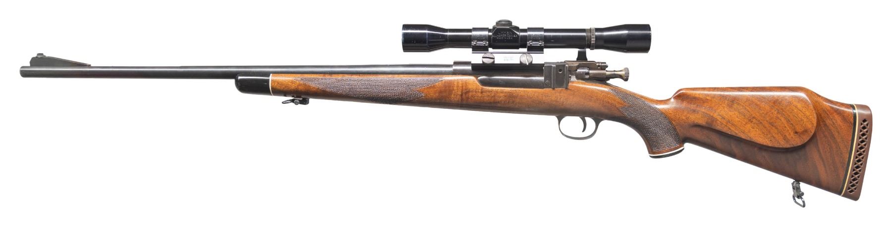 ACTION RIFLE. Cal. 30-40 Krag. S# 241128. Bbl. 22 3/4". Rifle has been professionally sporterized by shortening the original barrel, replacing the original stock with a checkered sporting style and by replacing the original sights. Receiver is equipped with base for an aperture sight. The slide and aperture are not present. Ramp front sight with Marbles 57 gold bead. Receiver has Weaver scope mount marked "SIDE-1"H". This is mounted on the left rail. The mount carries a Lyman All-American 4X scope with tapered post and crosshair reticle. Scope has gloss black alloy 1" tube. Bolt handle has been ground to clear the scope and a low scope Buehler safety is fitted. Rifle is stocked with a checkered walnut sporter type with raised cheekpiece Monte Carlo comb. Ventilated recoil pad. Black grip and forend tip with white spacer. 1" QD sling swivels are fitted. CONDITION: stock, which has a professional looking fit, has very light wear and scattered tiny handling marks. Metal has been polished and blued and retains most of this finish, however receiver is turning gray. Scope has light wear and notable scratches. Optics appear serviceable. Bore has a degree of shine with notably worn lands. (25-6588/RW). MODERN. $300-400.