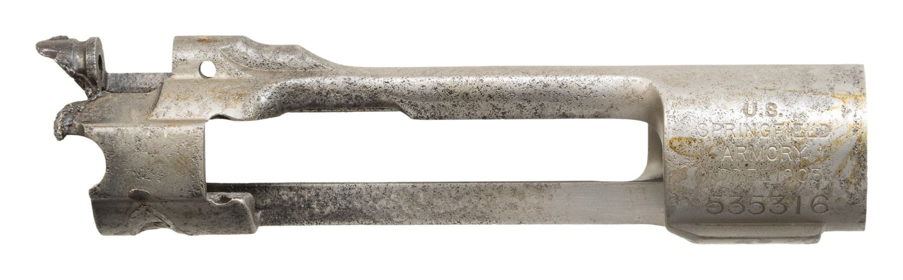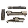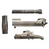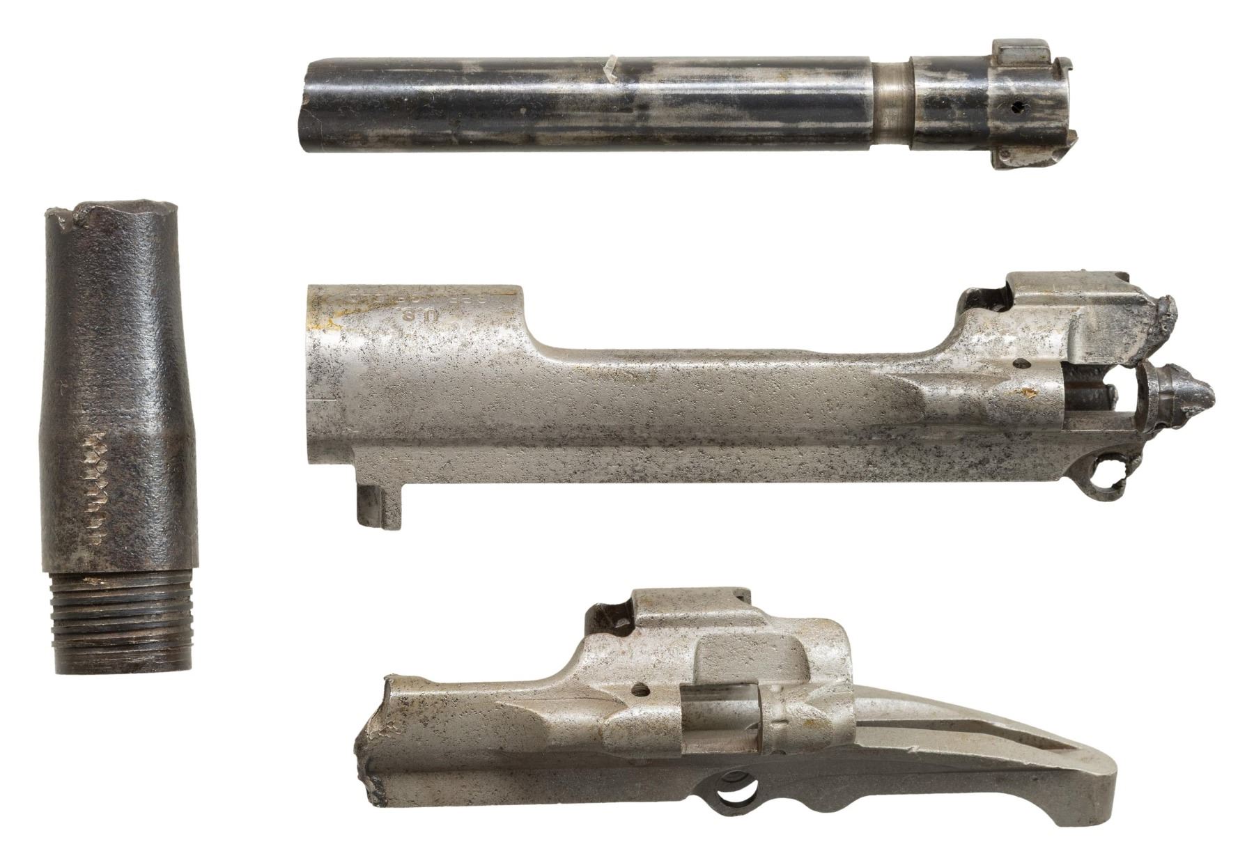 PARTS. S# 535316. Receiver manufactured 1913 has been flame cut, removing everything behind the receiver bridge, rendering the early receiver totally unserviceable. There is a rear part of a receiver consisting of the bridge cutoff area and trigger location. The forward end of the receiver has been removed at midpoint of magazine well and is not present. Unmarked bolt broken at the rear of the bolt shroud threads and consists of only the forward portion of the bolt. The barrel consists of a 3" section of the breech, which has been flame-cut. CONDITION: receiver parts have extensive wear, oxidation and fine pitting. Bolt retains some of its original blue. Barrel is oxidized and pitted. (25-4352/RW). MODERN. $50-75.