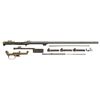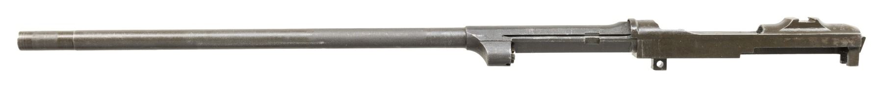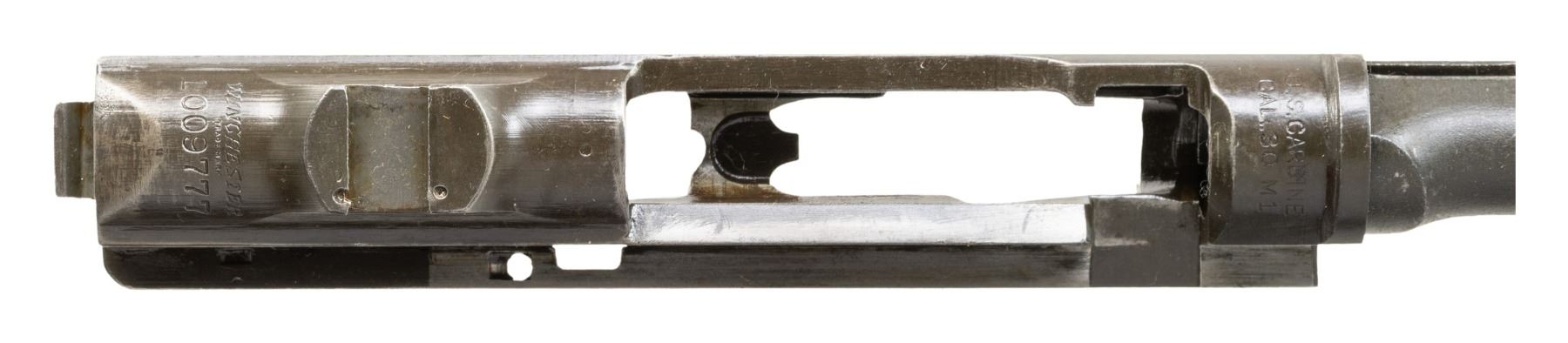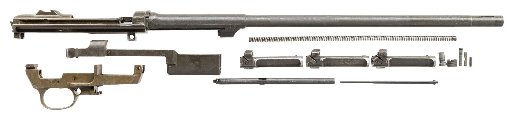 Cal. 30 Carbine. S# 1009777. Bbl. 18". Barrel is marked behind front sight area "flaming bomb / WRA / 12-42". Barrel is not turned tight in receiver. Receiver is not equipped with rear sight, but has two punch marks at the sight dovetail. Receiver made with separate recoil spring tube. Tube recoil spring and guide are present. Additional parts present marked "W" include straight cut slide, stripped milled trigger housing, three complete flat bolt assemblies. Small parts include gas piston and nut. Front sight key and trigger guard retaining pin. CONDITION: parts retain approximately 60% of their original worn finish. Trigger guard is parkerized with notably less finish. Very good shiny bore with sharp lands. (25-6272/RW). MODERN. $200-300.