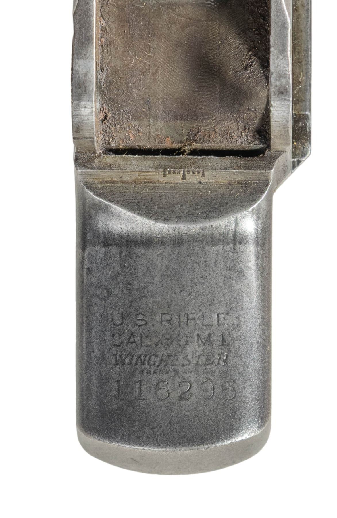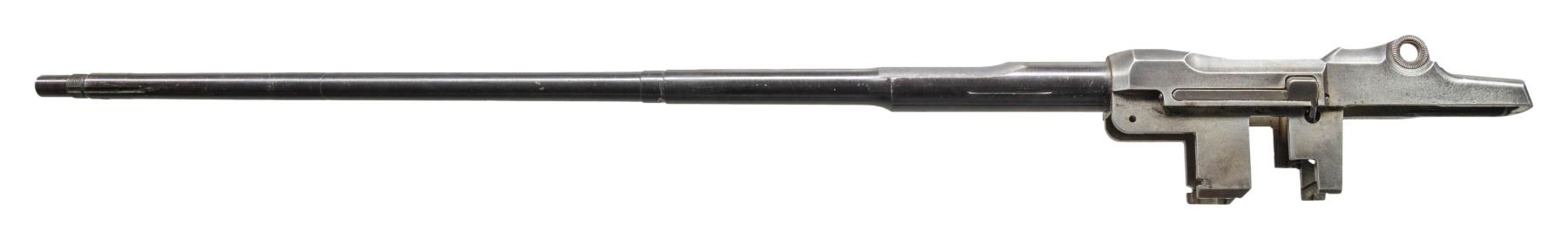 Cal. 30-06. S# 116206. Bbl. 24". Blued replacement barrel is marked only w/ import mark on right side. Throat & muzzle gauges less than 1.0. Receiver is fitted only w/ clip latch assembly. CONDITION: receiver has extensive wear, rendering markings at heel somewhat obscure, has turned overall gray w/ several spots of fine pitting. Barrel retains most of its arsenal rework blue finish. Worn dark bore. (25-3000/RW). MODERN. $100-200.
