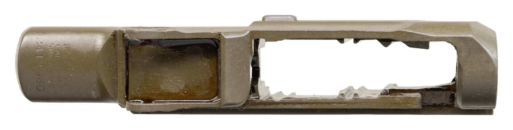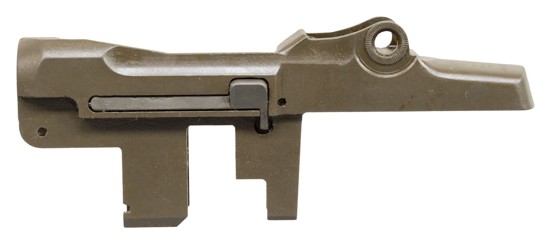 S# 2414960. M1 Garand receiver manufactured in 1944. Clip latch is installed. Receiver contains no additional parts. CONDITION: receiver retains 95% of its arsenal rework parkerized finish under a coating of protective grease. (25-3053/RW). MODERN. $200-300.