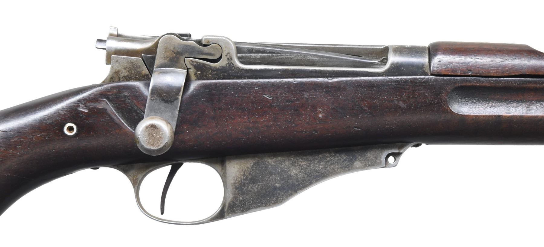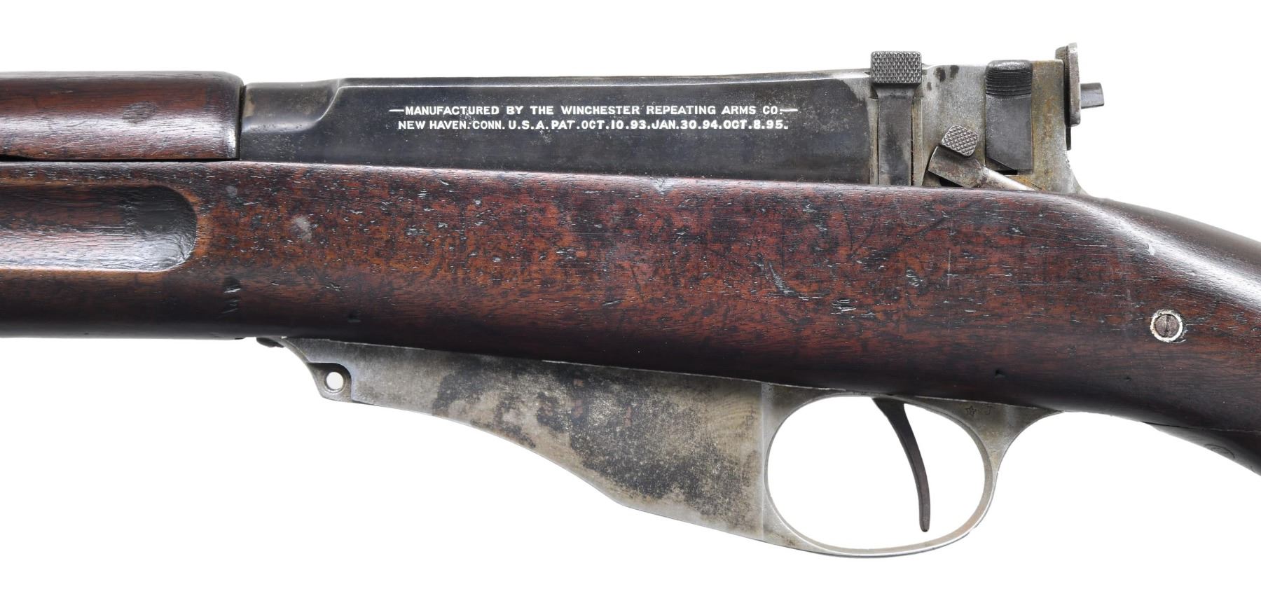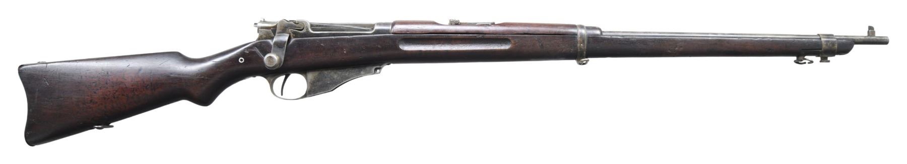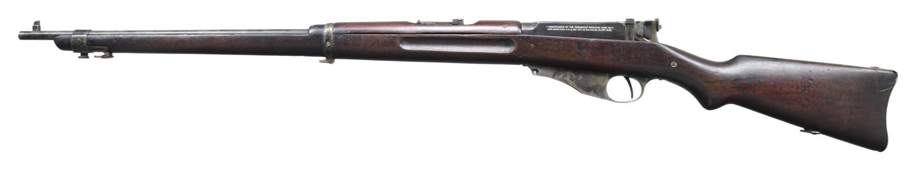 BOLT ACTION RIFLE. Cal. 6mm Lee Navy. S# 11303. Bbl. 28". Receiver ring is marked on top w/ white enhancement "U.S.N. / T / 11303 / N.C.T.". Receiver is marked on left side w/ "WINCHESTER REPEATING ARMS CO. / address & patent dates". Bolt has pinned-on gas shield. Receiver does not have the hardened screw on left rail. Walnut stock set. Buttstock has grasping grooves. Ladder rear sight graduated to 2,000 yards. Blade front sight. Upper band w/ stacking swivel & bayonet lug. CONDITION: stock set has worn arsenal rework refinish w/ numerous handling marks. Notable loss of wood around buttplate. Buttstock has numerous repaired cracks around the grip area on both sides. Handguard has full length repaired crack on top. Metal retains traces of blue turning gray w/ wear & fine pitting throughout. Dark oxidized bore w/ worn lands. (25-2200/RW). CURIO. $500-800.