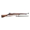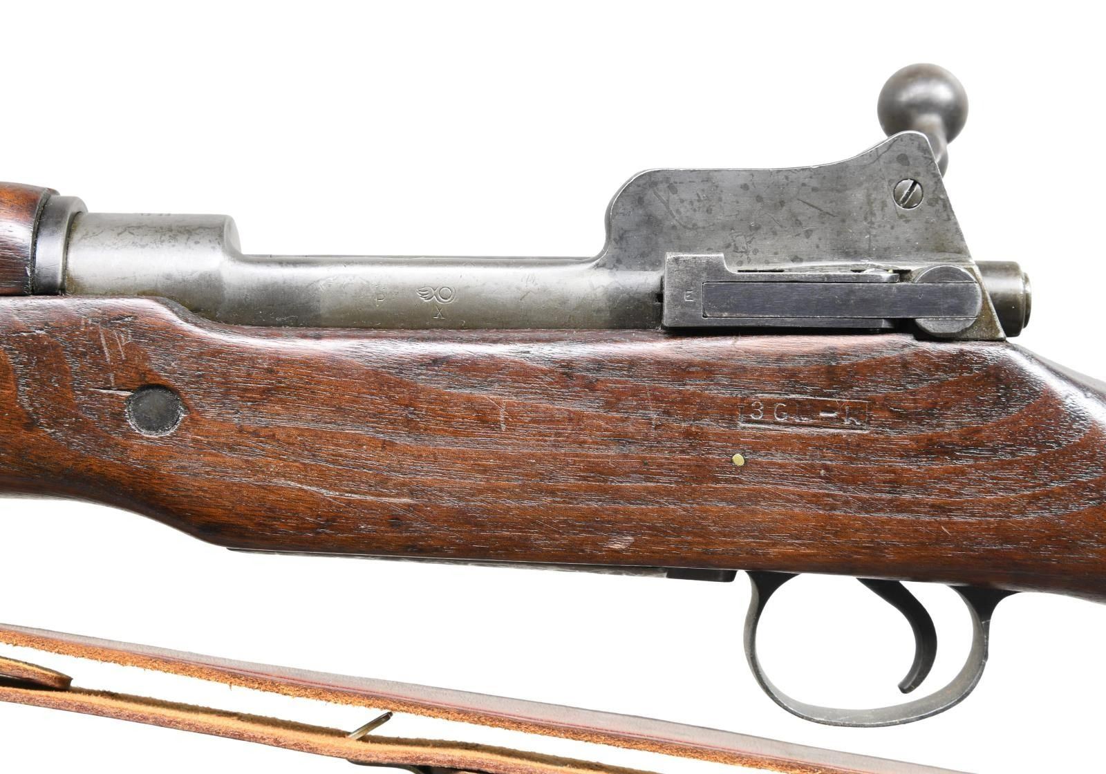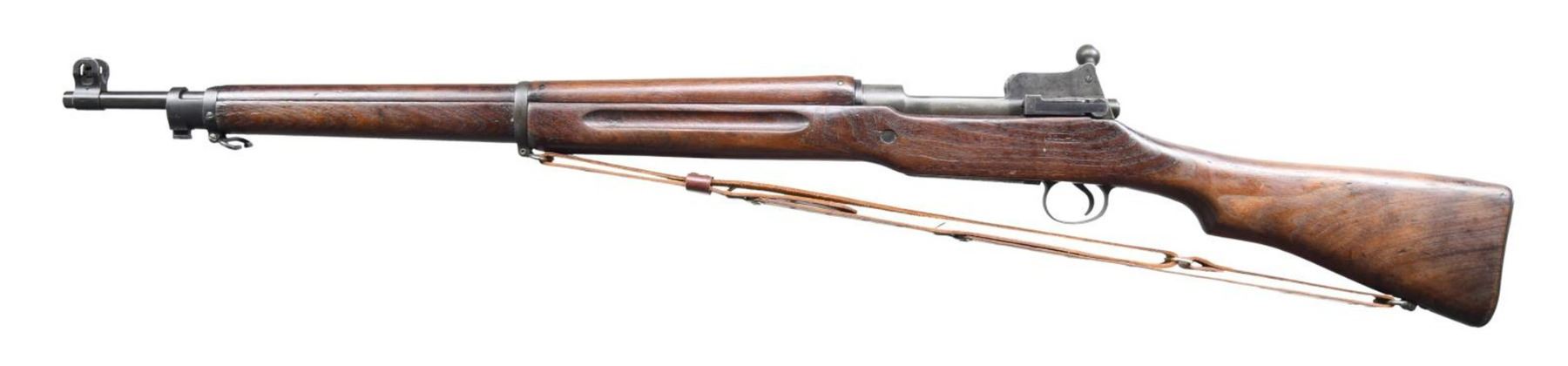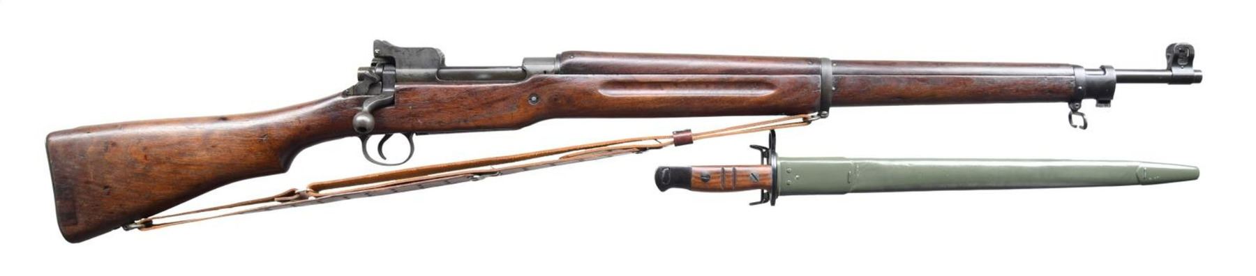 MILITARY RIFLE. Cal. 30-06. S# 480667. Bbl. 26". Replacement bbl. is marked behind front sight "W", flaming bomb, "12-17". Ladder aperture rear sight. Ladder is marked "E". Blade front sight w/ protective ears. Sight base is marked "E". Left receiver rail is marked on top w/ 2 eagle acceptance marks. Marked on left side w/ flaming bomb. "P" & "X". Bolt handle is marked on top w/ flaming bomb and "X". Marked underneath w/ "E". Cocking piece marked "EN". Bolt stop marked "E". Walnut stock set. Buttstock is marked on left side above trigger guard w/ boxed "3GM-K" which is an unidentified arsenal rework marking. Stock is marked on top of grip w/ "L" & marked underneath grip w/ "10" & an eagle acceptance mark. Forend tip is marked "E". Smooth trap buttplate. Brown military type sling. UNATTACHED ACCESSORIES: 17" fullered blade reproduction Model 1917 bayonet. Left ricasso marked w/ prominent "1917 U.S." and has very faint "WINDLASS" & "MADE IN INDIA". Right ricasso marked "MD over "E". Grooved hardwood grips. Scabbard resembles WWI type leather w/ metal tips. Painted overall green. Bayonet in very good condition. CONDITION: stock set has moderate wear & handling marks over arsenal rework finish. Inletted repair on right side of butt. Metal is a mix of moderately worn original finishes. Bore is shiny w/ sharp lands but has spots of scattered oxidation and pitting. PROVENANCE: from The Lifelong Collection of Robert "Mike" Bricker. (24-1015/RW). CURIO. $500-800.