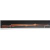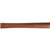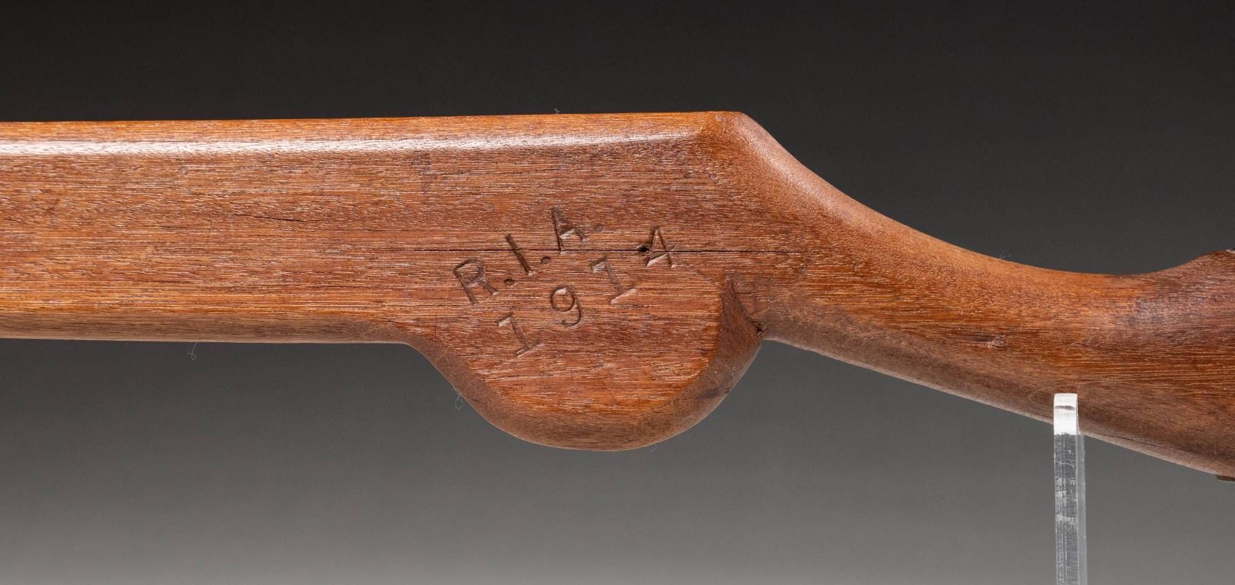 BAYONET TRAINER. This interesting trainer is described on pages 104 and 105 of "The Springfield 1903 Rifles by Brophy". The book refers to the 1913 manual of the bayonet which describes the use of this wooden rifle which was used in conjunction with gloves, masks and plastrons. The issue "RIA" marked wooden rifles appear to be manufactured from dense mahogany. The "rifle" measures approximately 59 3/4" overall. 1 5/8" thick. Prominently marked "R.I.A. / 1914" on the left side and "7" on the right side. The outline resembles a rifle with a bayonet, while the bayonet has a rounded leather-covered pad affording some protection to the victim. The "rifle" is reinforced with three vertical iron rivets and interestingly has a grasping groove on one side only in the forend area. CONDITION: trainer is in very good condition with light wear and handling marks. There are scattered age cracks running lengthwise with the grain. The buttstock has more notable fine cracks throughout. Leather pad has light wear and scuffing. PROVENANCE: From the BuckStix Collection. (02-26027/RW). NON-GUN. $400-600.