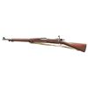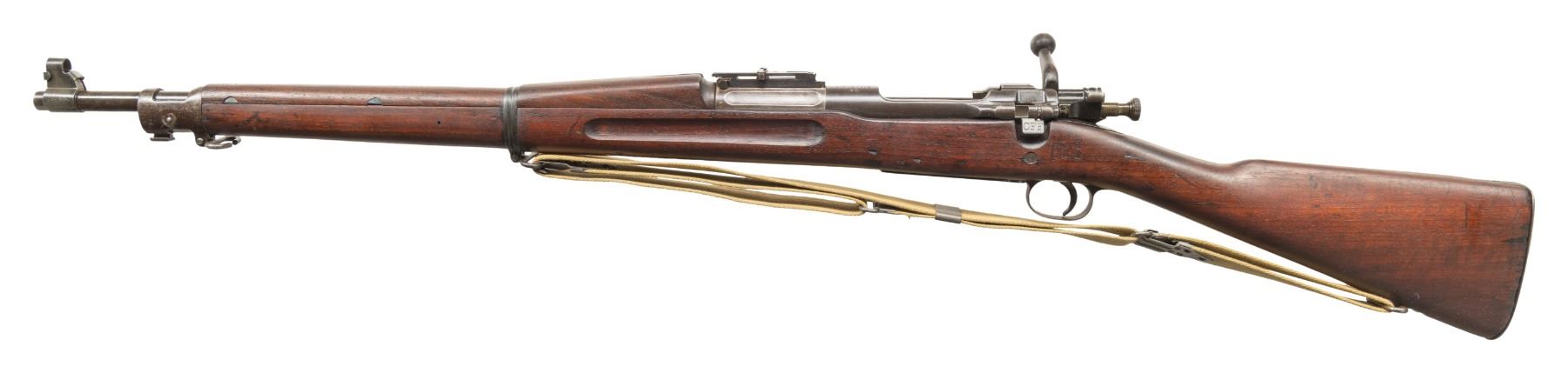 MILITARY RIFLE. Cal. 30-06. S# 573620. Bbl. 24". Barrel marked behind front sight "SA / flaming bomb / 2-14". Receiver manufactured in 1914. Ladder rear sight graduated to 2,850 yards with volley notch. Dished windage and elevation knobs. Blade front sight. Sight cover has "C64157-4" drawing number. 1903 bolt with unmarked straight down bolt handle. All milled furniture including fine checkered buttplate. "S" type straight grip walnut stock and handguard. Stock markings have been rendered illegible due to arsenal rework type finish. Forend tip has the Springfield "S" marking. Handguard appears to be later replacement. Tan WWI era Kerr Nobuckl sling. CONDITION: stock set has a moderately worn arsenal rework finish with slight loss of wood in buttplate area and numerous handling marks throughout. Metal turning gray and patina with some areas of worn thinning original blue. Shiny bore will strong sharp lands. (25-6289/RW). CURIO. $800-1,200.