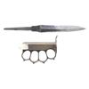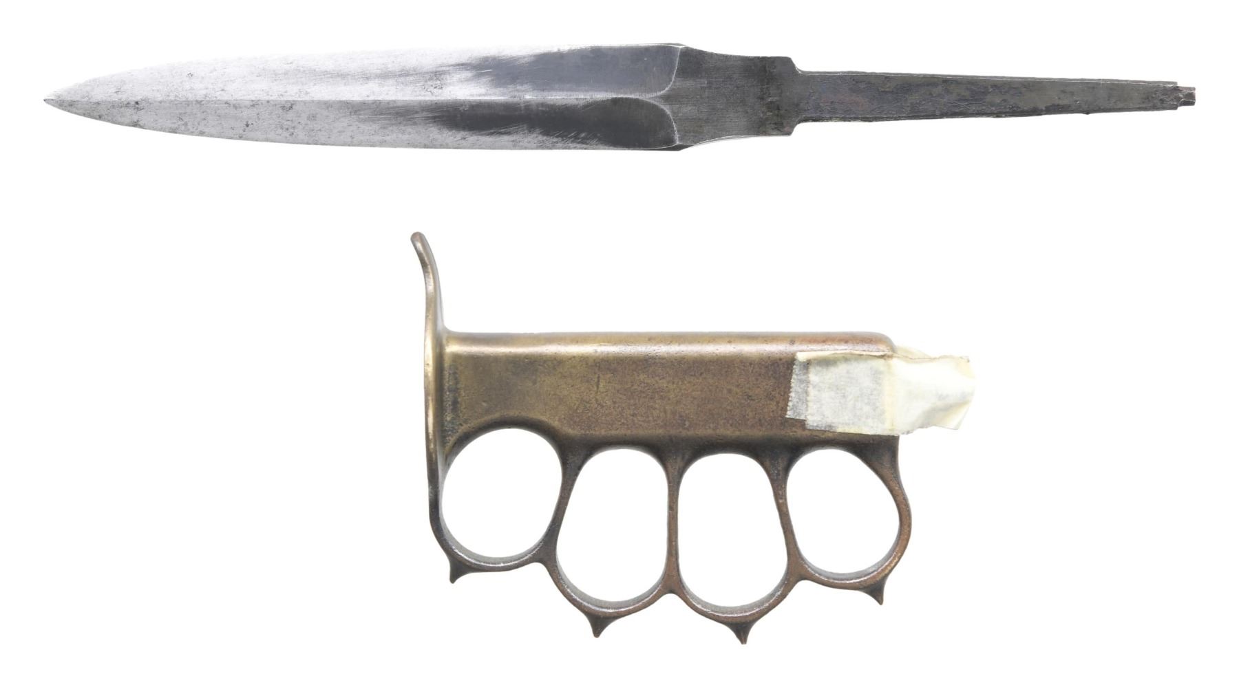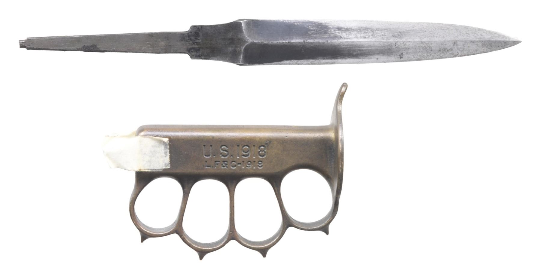 U.S. Model 1918 trench knife mfg. by L.F. & C. in 1918. Right side of the handle is marked "U.S. 1918/ L.F&C-1918". Blued blade and steel domed nut skull crusher, with blackened brass knuckle duster handle featuring a spike at the end of each finger slot. CONDITION: blade and domed nut skull crusher retain good amounts of their original blue finish, exhibiting areas of wear and thinning that show through to gray patina, with some striations from prior cleaning and spots of light surface oxidation. Blade tang is broken at the nut threads and requires repair. Brass handle exhibits a dark patina overall. (02-23947-4/MLW). $800-1,200.