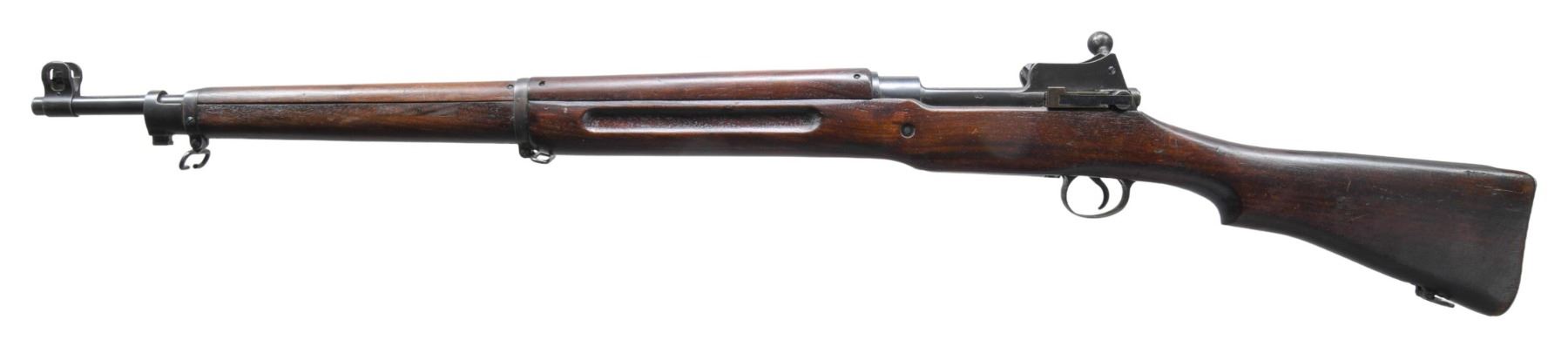 RIFLE. Cal. 30-06. S# 389824. Bbl. 26". Barrel marked behind front sight "R / flaming bomb / 7-18". Ladder rear sight marked "R" graduated to 1,600 yards. Blade front sight w/ protective ears. Receiver is marked on left front rail w/ "flaming bomb" & two eagle head acceptance marks. Bolt is marked "R". Bolt sleeve & cocking piece are marked "E". Walnut stock set. Stock is marked "R" on forend tip. Stock has legible eagle head "339" ahead of trigger guard & eagle head "30?" behind trigger guard. CONDITION: buttstock has arsenal rework type finish w/ added finish over moderate wear & handling marks. Handguards appear to be replacements & retain their lightly worn original finish. Metal retains a large degree of original blue w/ thinning & light wear. Replacement parkerized bolt has notable thinning in wear. Very good shiny bore. (25-3905/RW). CURIO. $700-900.