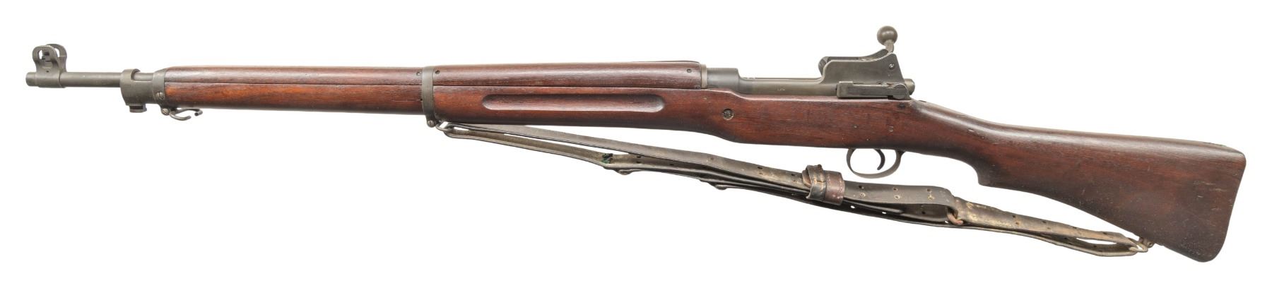 RIFLE. Cal. 30-06. S# 309734. Bbl. 26". Barrel marked behind front sight "R / flaming bomb / 5-18". Ladder rear sight graduated to 1,600 yards. Blade front sight with protective ears. Bolt handle is marked underneath with "flaming bomb / K". Cocking piece is marked "W". Sight ladder marked "R". Sight spring marked "E". Nice original finish walnut stock set. Stock tip is marked "W" indicating Winchester manufacture and is additionally marked "20". "Eagle head / 512" acceptance mark found under grip and "19" on left side of stock over trigger guard. Brown leather Model 1907 sling with one replacement steel hook. Sling is marked "WEH". UNATTACHED ACCESSORIES: plastic oiler in butt. CONDITION: stock set has light wear and scattered handling marks. Metal retains a very large degree of its arsenal rework parkerized finish. Sling shows extensive wear and flexing. Very good shiny bore with sharp lands. (25-2779/RW). CURIO. $350-500.