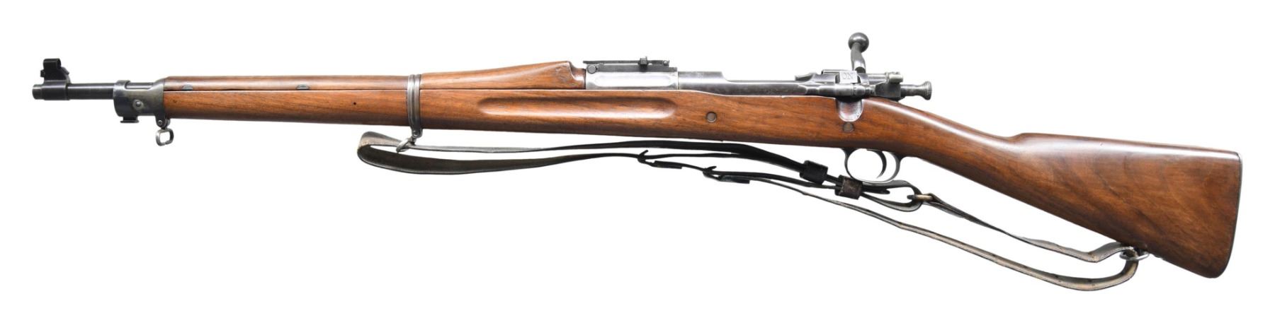 MILITARY RIFLE. Cal. 30-06. S# 841679. Bbl. 24". Bbl. marked behind front sight "SA / flaming bomb / 4-18". This very early production Model 1903 rifle had its bbl. replaced in the WWI era & carries a replacement bold w/ a swept handle. Ladder rear sight w/ volley notch & dished windage & elevation knobs. Blade front sight w/ stamped sight cover. Bolt handle is marked on top "6" & "7". Marked underneath w/ punch proof. All milled furniture including trap buttplate. Floorplate follower & follower spring are not present. Walnut "S" type straight grip stock set w/ two recoil bolts. Brown leather Model 1907 sling dated "1918". Sling is heavily worn w/ cracking. UNATTACHED ACCESSORIES: nickel-plated oiler in butt. CONDITION: stock set has arsenal rework finish w/ loss of wood & softened edges. Markings are not visible. Metal has well-worn thinning original blue finish turning gray w/ handling marks. Bore is shiny, but w/ worn lands. (25-2194/RW). CURIO. $300-500.