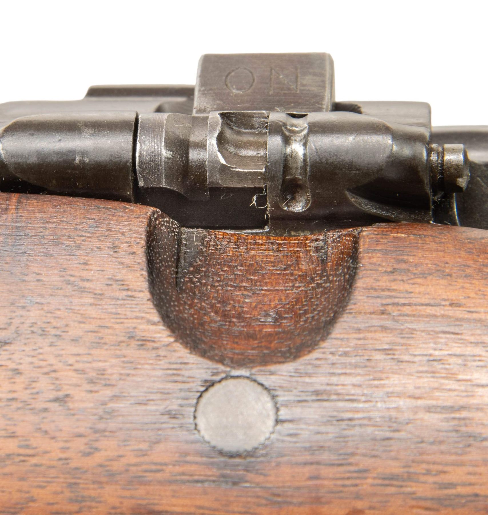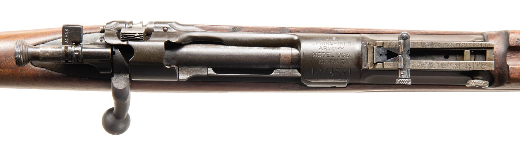 MILITARY RIFLE. Cal. 30-06. S# 1074041. Bbl. 24". Barrel marked behind front sight "SA / flaming bomb / 2-19 / A". The MKI rifle was manufactured at Springfield Armory to accommodate the Pedersen device. This device replaced the standard bolt in the rifle with a mechanism to fire the 30 Pedersen cartridge in a semi-auto mode, utilizing the slot in the left receiver rail as an ejection port. This rifle also retains its double sear and the modified cutoff and spindle. These parts are usually not present as many were replaced during arsenal overhauls. Ladder rear sight with volley notch graduated to 2,850 yards. Dished windage and elevation knobs. Blade front sight. Bolt with swept handle is marked on top "7" and marked underneath with punch proof. Safety is marked "S". All milled furniture including smooth trap buttplate and smooth trigger. Walnut stock set with "S" type straight grip buttstock. Stock made with two reinforcing bolts. UNATTACHED ACCESSORIES: nickel-plated oiler in butt. CONDITION: stock has arsenal rework type finish removing original markings and with notable loss of wood near buttplate and inletted areas. Metal retains 80% of its original parkerized finish with light wear and scratches. Very good shiny bore. PROVENANCE: Invoice from Poulin Antiques & Auctions dated 10/24/25 and two pages of handwritten data notes. (25-6031/RW). CURIO. $500-800.