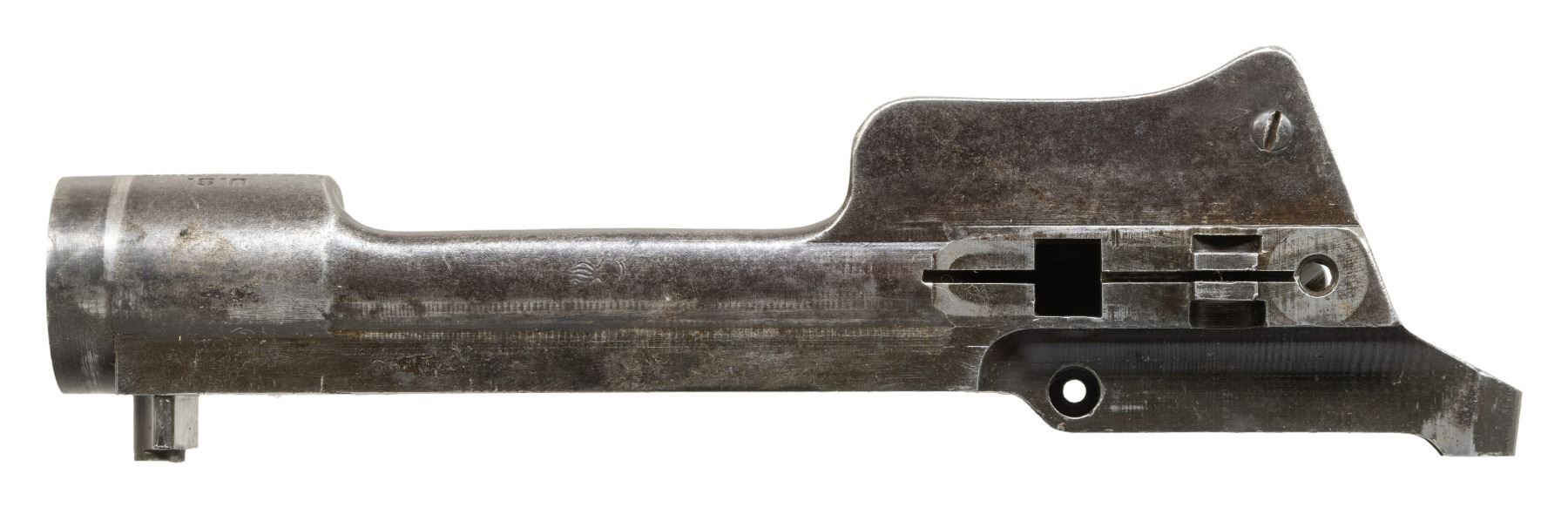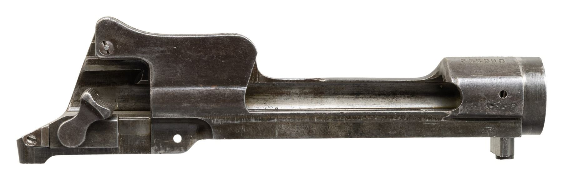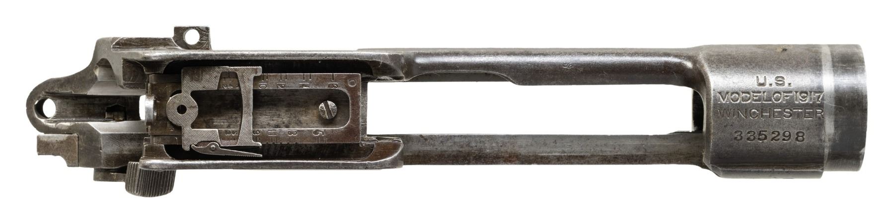 RECEIVER. S# 335298. Receiver ring is marked on top "U.S. / MODEL 1917 / WINCHESTER". Receiver has faint eagle acceptance mark on top of right rail and "flaming bomb" on left rail. Ladder rear sight marked "W". Spring is unmarked. Safety assembly is present. Receiver contains no additional parts. CONDITION: receiver retains traces of its original blue turning gray with areas of fine pitting. Notable area of pitting on right side of receiver ring just above wood-line. (25-3118/RW). MODERN. $100-200.