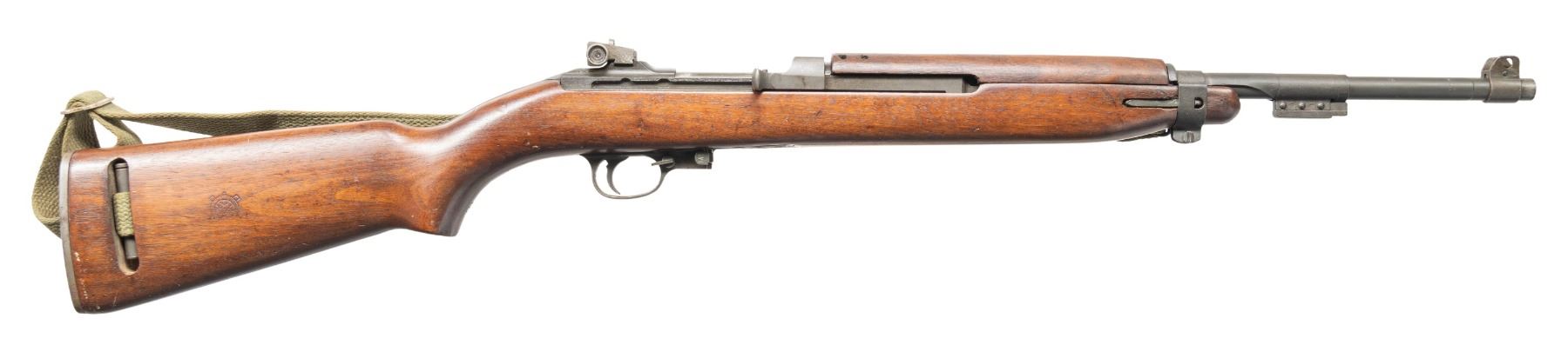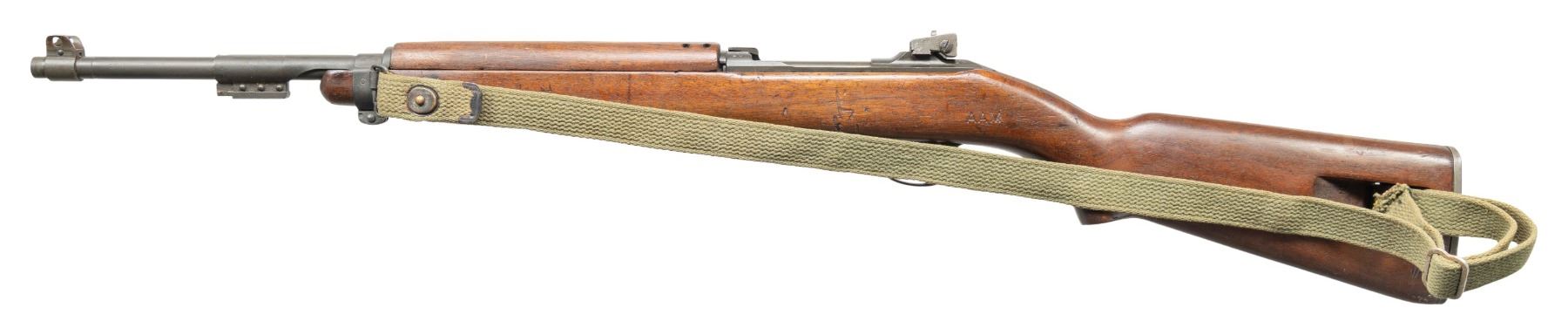 Cal. 30 Carbine. S# 5071494. Bbl. 18". Barrel markings behind front sight are very faint, but appear as "INLAND MFG. DIV. / GENERAL MOTORS / 3-44". Milled adjustable rear sight. Marked only with faint "crossed cannons". Blade front sight with protective ears. Barrel band with bayonet lug marked "C". Straight cut slide marked "N". Round bolt marked ".U.". Milled trigger guard marked "INLAND". Rotary safety. Straight cut hammer marked "LT-Q". Low wood oval cut walnut stock marked "HI" in sling slot. "Crossed cannons" on right side of butt. "P" proof under grip. Marked on left side with "AAM" indicating overhaul at Augusta Arsenal. Four rivet handguard marked "LJ". Green web sling. CONDITION: stock set with its arsenal rework finish has moderate wear and handling marks throughout. Metal retains 80% of its arsenal rework parkerized finish with light wear. Receiver has been drilled and tapped on left side for scope mount. Very good shiny bore. PROVENANCE: Estate Collection of John "Jack" Dhooghe. (25-5550/RW). CURIO. $500-800.