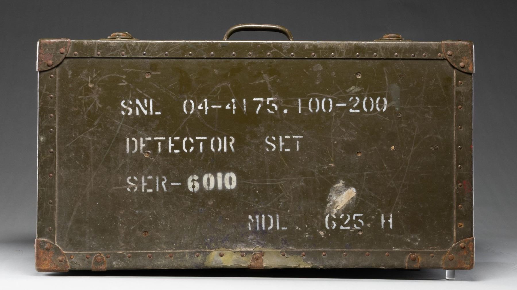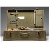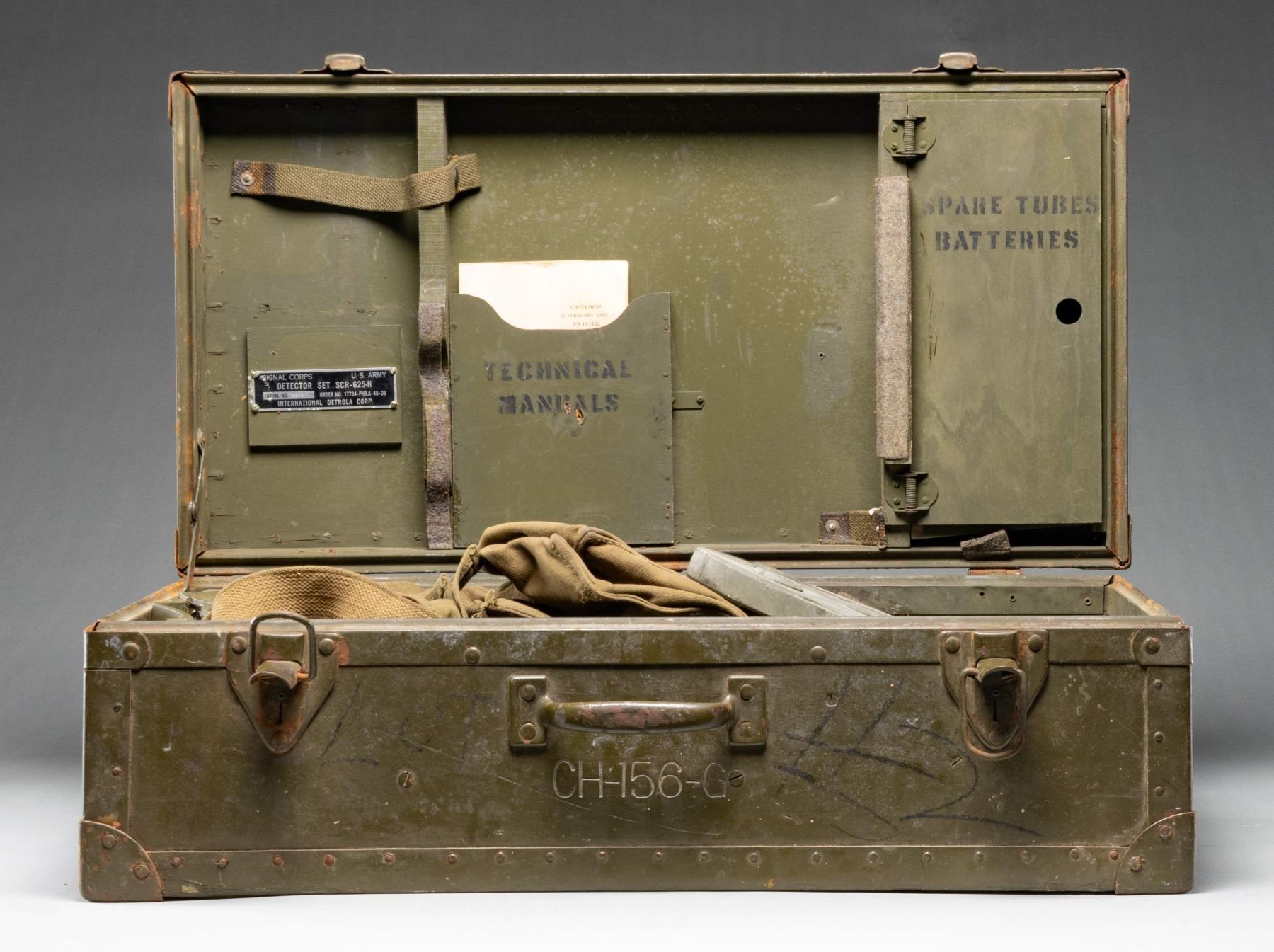 MINE DETECTOR. SCR-625-H mine detector mfg. by International Detrola Corp. Exterior of trunk style case is marked "SNL 04-4175 100-200/ DETECTOR SET/ SER-6010/ NDL 625 H" on the lid, with "CH56-G" marked by the handle on the body. Interior of lid exhibits a data plate with a matching S#, slot with TM 11-1122 technical manual, and a compartment with a spring hinged door containing a sealed spare tube. Chest appears complete, containing the detector, detector rod, amplifier box, clamp, and headset frame. CONDITION: metal detector and accessories show general overall wear, with some scattered spots of surface oxidation. Trunk shows moderate overall wear, with areas of surface oxidation on metal fittings. (02-25075/MLW). NON-GUN. $200-300.