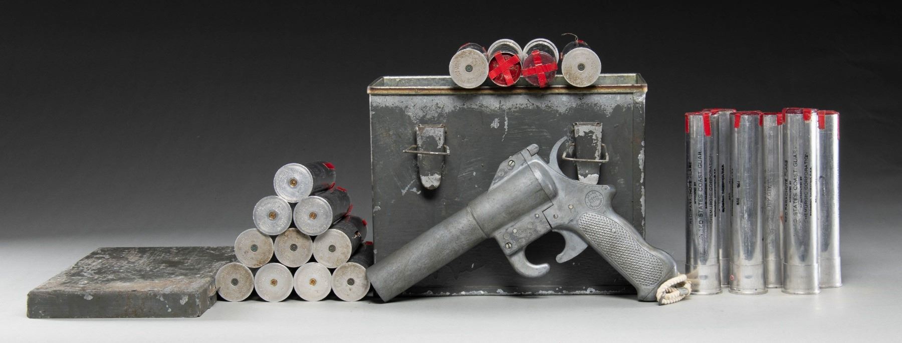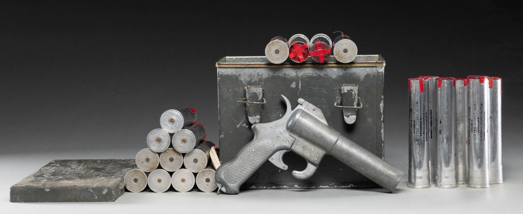 AMMUNITION CHEST & FLARES. U.S. WWII flare pistol mfg. by Sklar. Left side of the frame is stamped with an encircled "SKLAR/ SIGNAL/ PISTOL/ SAN FRANCISCO". Left side of the bbl. assembly is stamped "PT8.44" (August of 1944) above the S# "Z 135". Cast alloy construction with checkered panels on sides of grip and lanyard slot on butt. UNATTACHED ACCESSORIES: steel ammunition box, containing 20 assorted 37mm flares. CONDITION: flare pistol is good, showing scattered superficial handling marks and spots of age related discoloration. Ammunition crate and flare rds. appear good and serviceable. (02-25142/MLW). NON-GUN. $300-400.