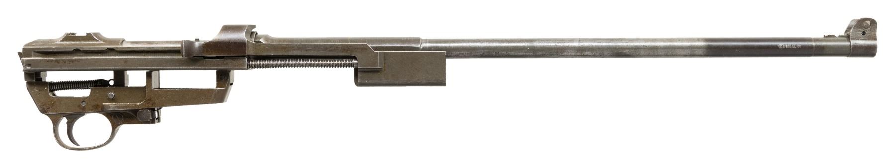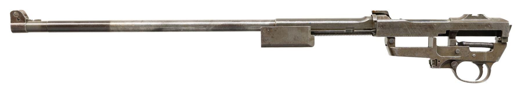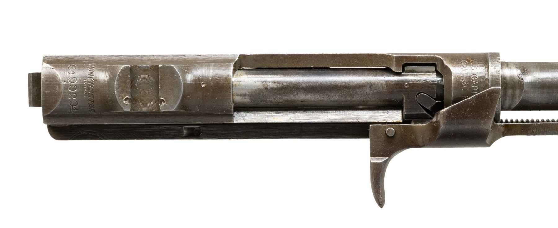 Cal. 30 Carbine. S# 6499294. Import marked on right side of barrel. Bbl. 18". Barrel is marked with "W" behind front sight. Six o'clock slide marked "W". Round bolt marked "W". Milled trigger guard marked "W". Push button safety marked "EW" and hammer as well as magazine catch also marked "W". Front sight is partially installed on muzzle end of barrel. No other parts are included. CONDITION: parts retain 50% of their worn original finish with spots of really light pitting. Bore is shiny with strong lands. (25-6273/RW). MODERN. $200-300.