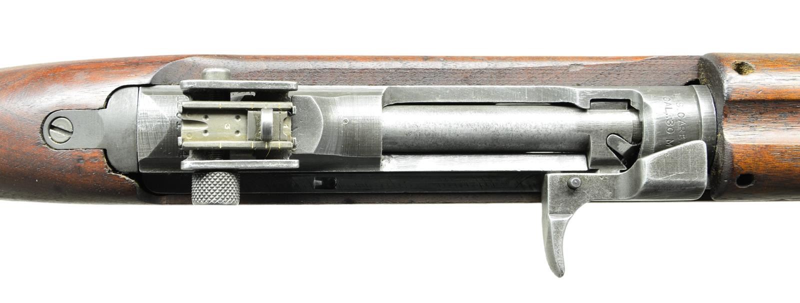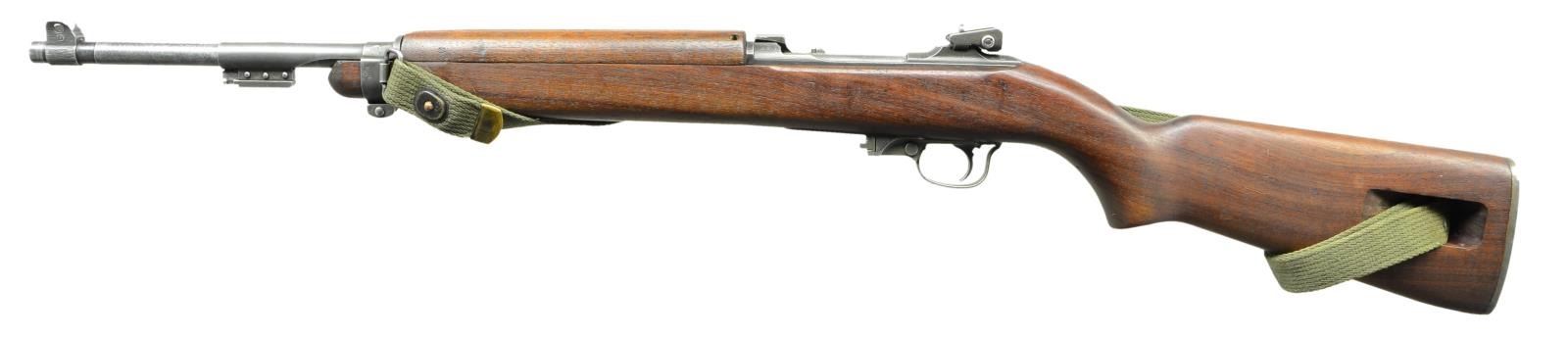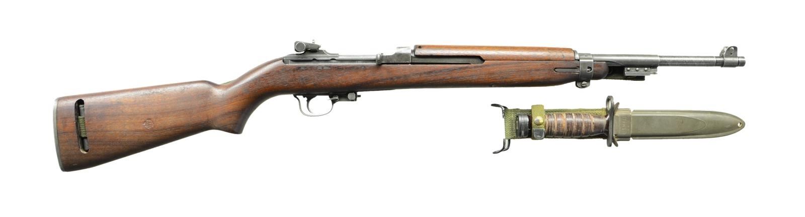 MILITARY RIFLE. Cal. 30 Carbine. S# 1201734. Bbl.18", marked on top w/ "W" plus "WP" oval proof; marked on right side over gas port w/ "ordnance bomb". Is additionally marked at bottom under chamber "O" & "Y". Stamped adj. rear sight marked "L.R.CO." Blade front sight w/ protective ears. Wide bbl. band marked "AMCO" w/ bayonet lug & wire type swivel. Straight cut slide marked "W". Rnd. bolt marked "AI". Stamped trigger housing marked "BE-B". Rotary safety. Mag. catch has 30 rd. extension. Straight cut hammer marked "HI". Low wood oval cut walnut buttstock marked on right side w/ "cross cannons"; marked "LW-B" in sling slot. 2 Rivet handguard marked "IO". Green web sling. MAGS: 1-15 rd. marked "RUGG". UNATTACHED ACCESSORIES: 6 3/4" blade bayonet marked at front of cross guard "U.S.M4 PAL"; leather washer handle. Green plastic scabbard marked "U.S.M8A1" & "B.M.CO." Bayonet has been lightly sharpened & retains approx. 60% originally parkerized finish. Grooved leather handle has wear & scuffing. Scabbard has light wear, staining & handling marks. CONDITION: buttstock has attractive arsenal rework type finish w/ light wear & scattered handling marks. Handguard has most of its original finish w/ light wear & handling marks. Metal retains 40% worn original finish w/ notable loss of finish on bbl. & band. Good shiny bore w/ lightly worn lands. (23-618/RW). CURIO. $800-1,200.