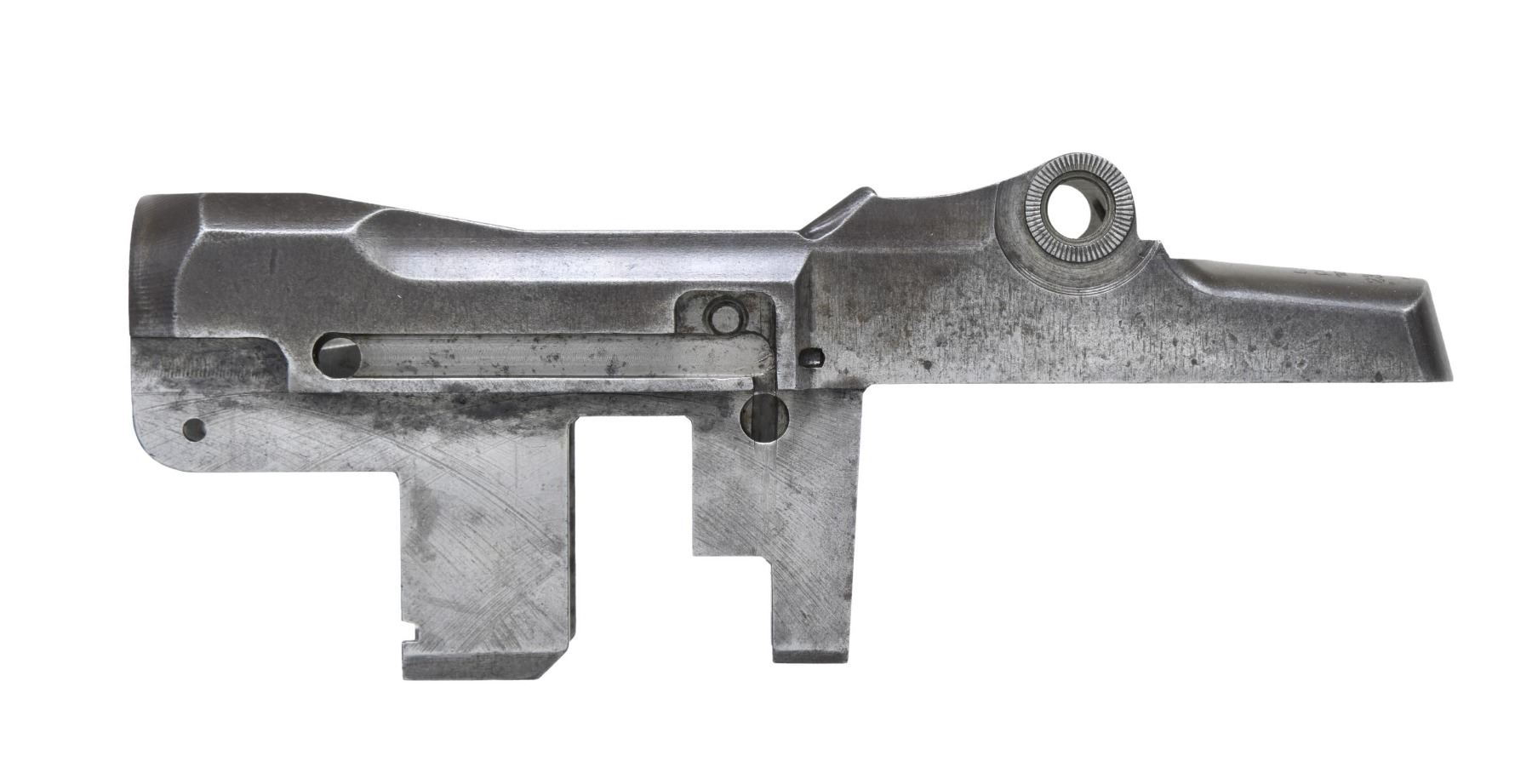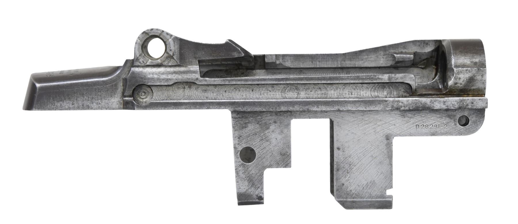 S# 2369248. Receiver produced in 1943. As well as having the standard Winchester markings at heel, it also has drawing number "D28291-2" at the lower front edge of the receiver. CONDITION: receiver has moderate wear, scattered handling marks & very light pitting w/ traces of its original wartime finish. Markings are legible. (25-3058/RW). MODERN. $300-500.