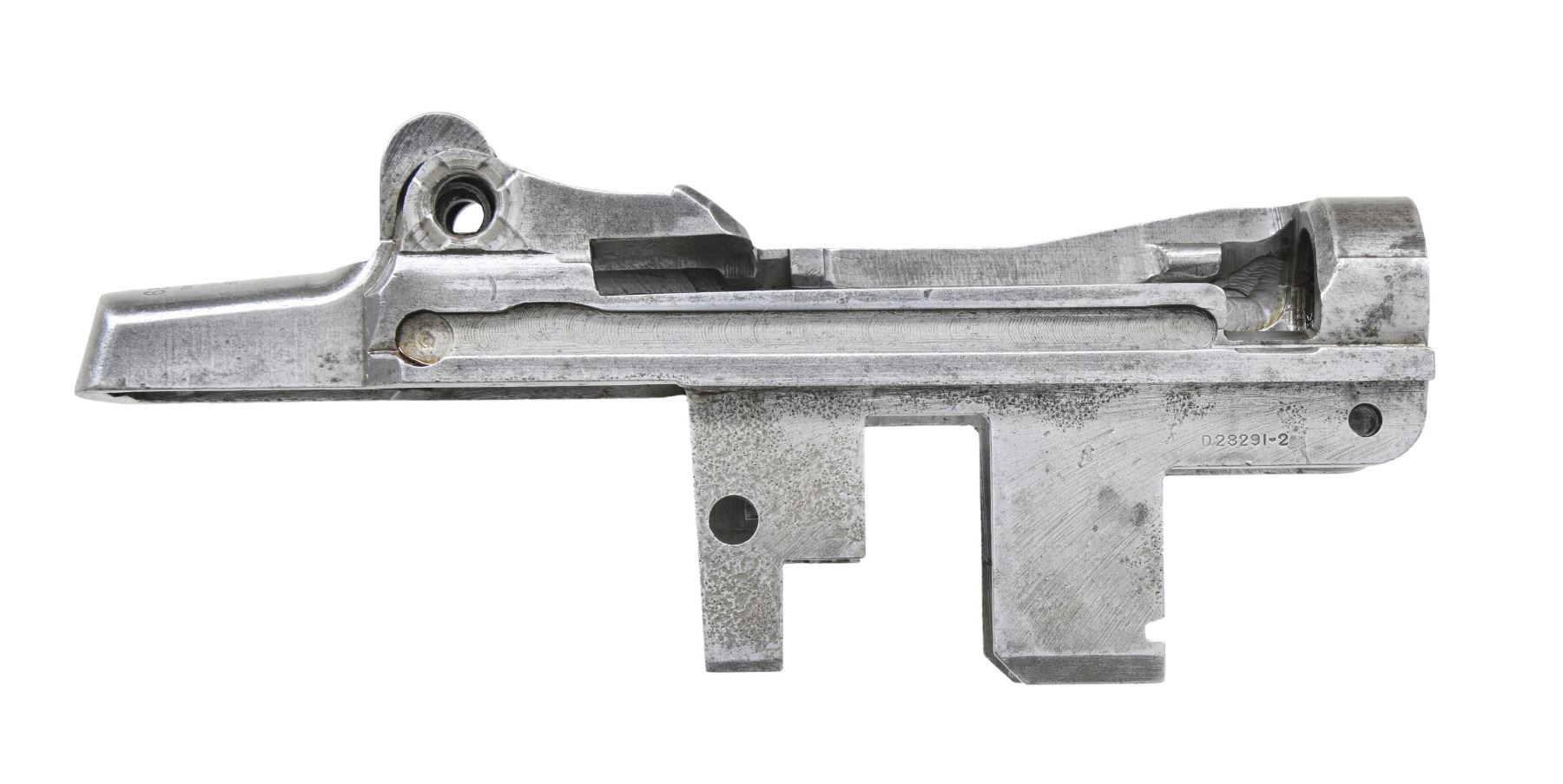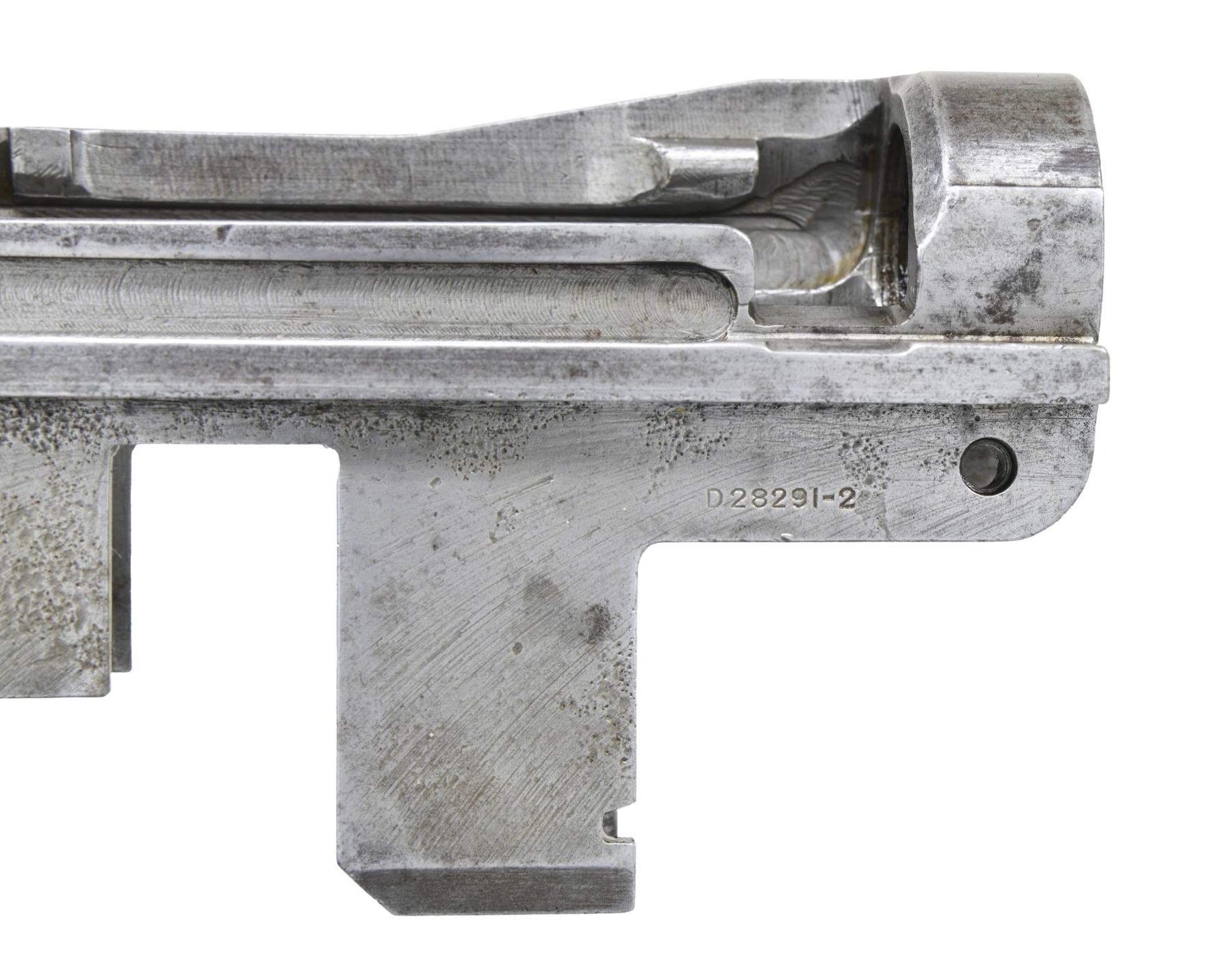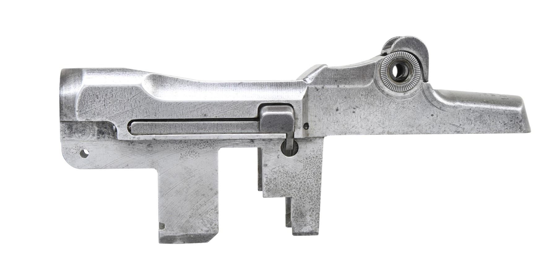S# 1221129, indicating manufacture in late 1942. Receiver is marked on the right side w/ drawing number "D28291-2". Rear of receiver has standard Winchester markings. Receiver is also marked underneath rear of right rail "B", "P" & a punch mark. Parts included are the clip latch, rear sight base & spring cover. CONDITION: receiver has a cleaned appearance turning gray w/ numerous areas of fine pitting prominent mostly on the receiver legs. (25-2900/RW). MODERN. $300-500.