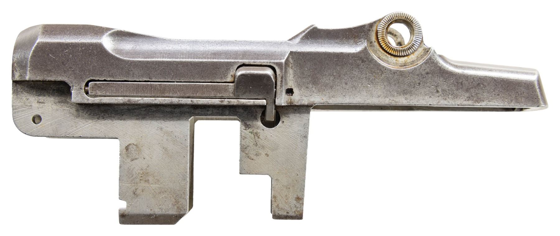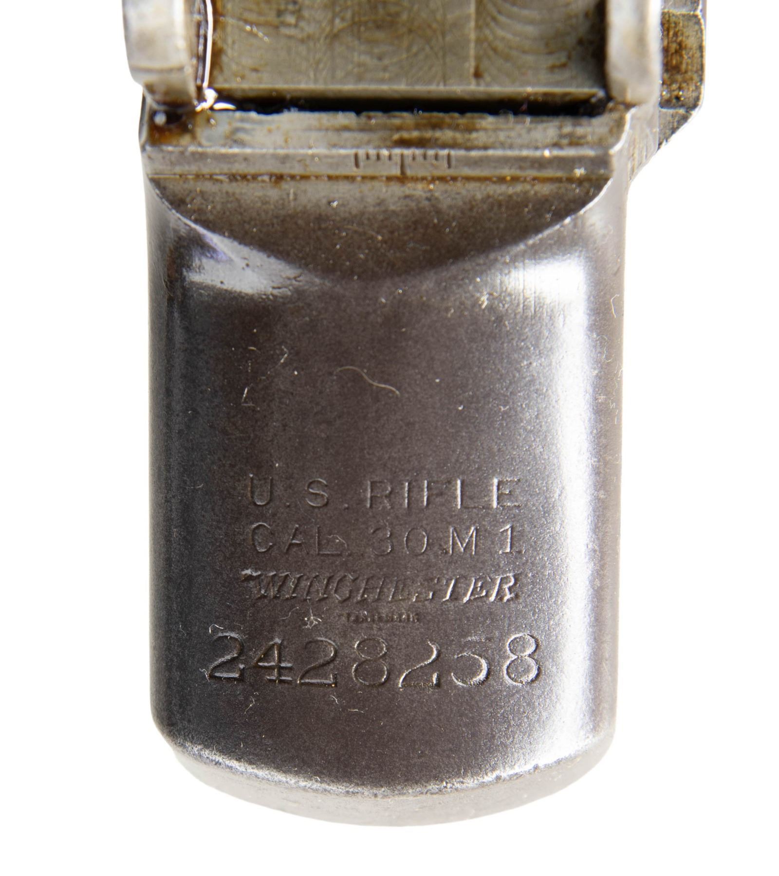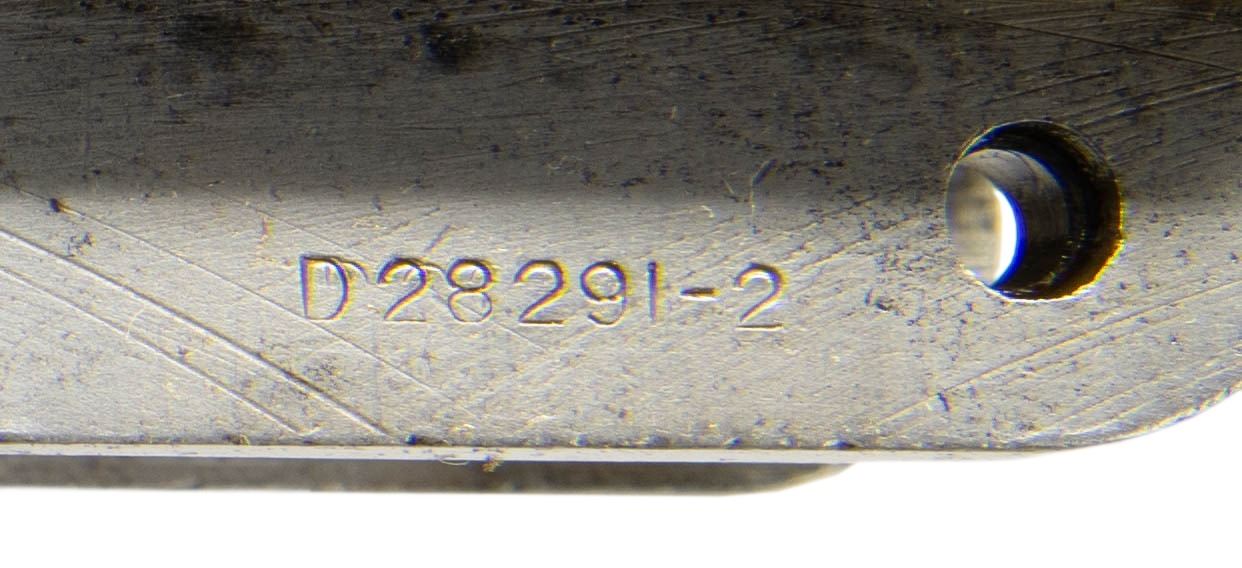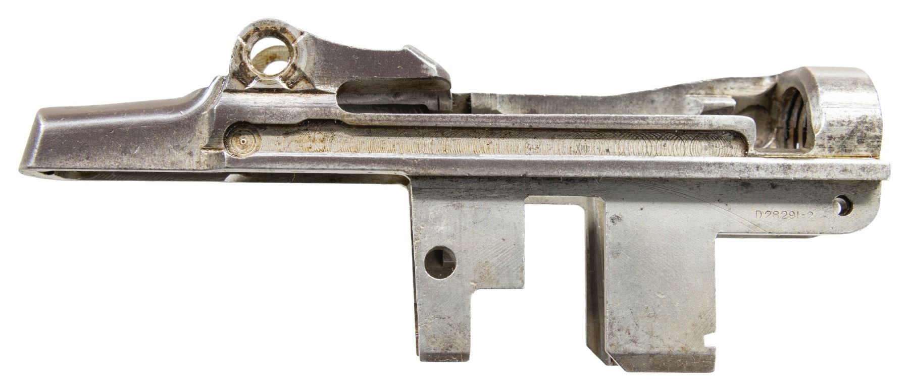 S# 2428258. Receiver marked at heel "U.S. RIFLE / CAL. .30M1 / WINCHESTER / serial number". Marked on right forward end "D28291-2". Receiver manufactured in 1944. Clip latch assembly is present. CONDITION: receiver exhibits wear & handling marks while retaining traces of original finish. (25-2913/RW). MODERN. $300-500.