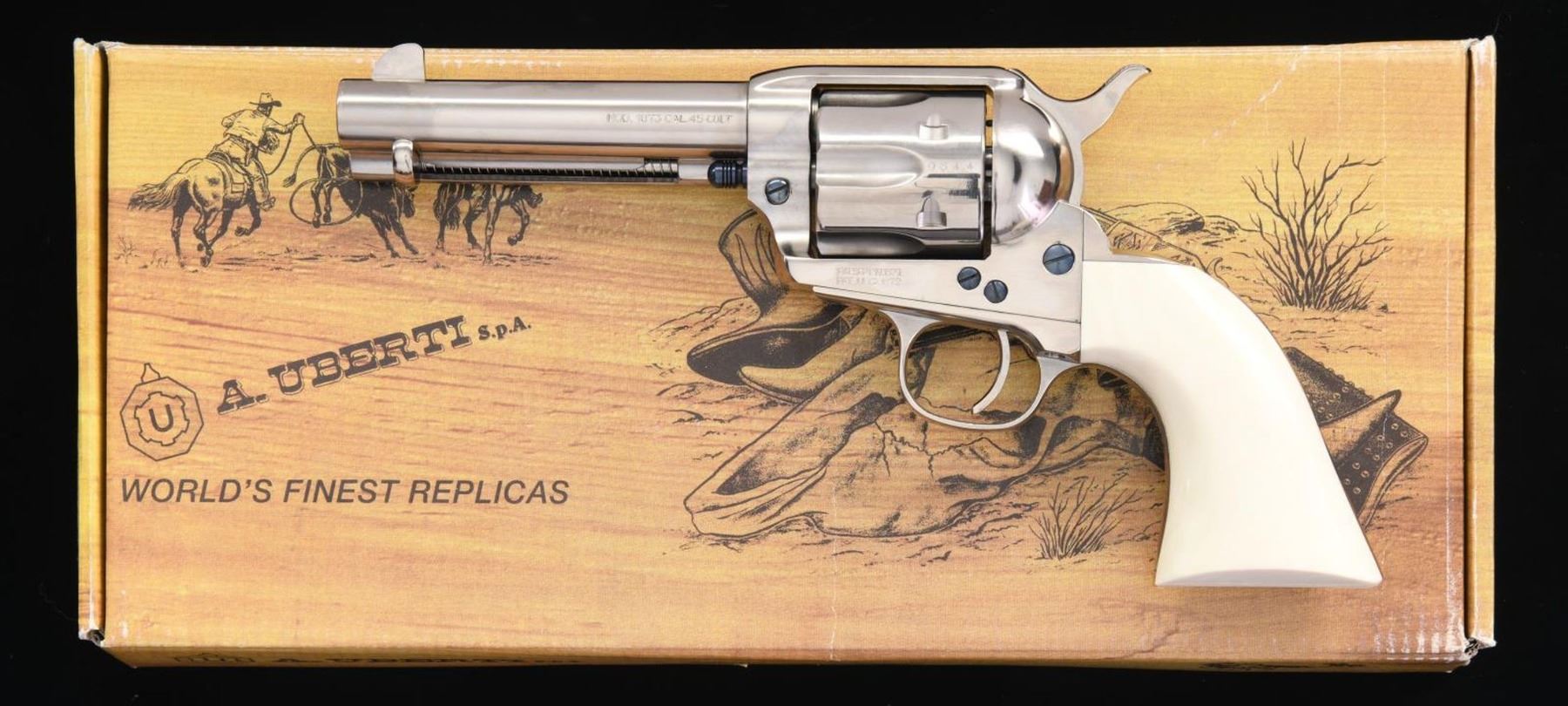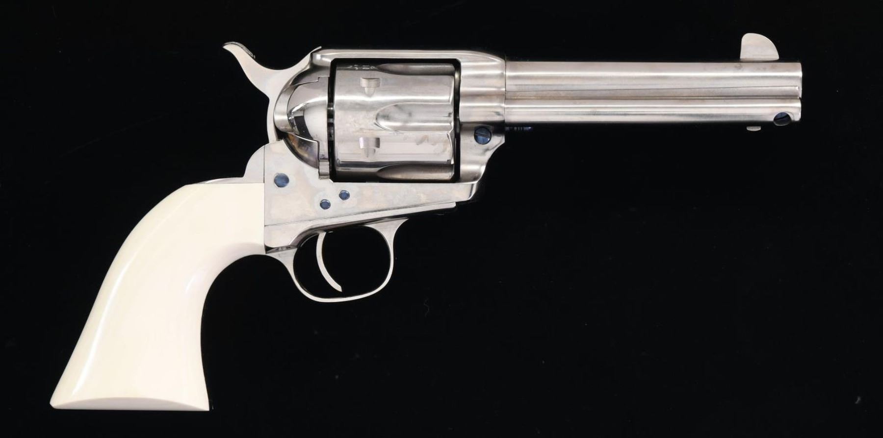 Cal. 45 Colt. S# UX0844. Bbl. 4 1/2". Blade front sight. Fixed rear sight. Nickel finish with fire blued screws. Simulated ivory grips. UNATTACHED ACCESSORIES: matching numbered factory box with manual & cable lock. CONDITION: all aspects are near new; in the box. PROVENANCE: the collection of Gun Sport Ltd., owned by Jon R. Thomas. (23-3873/MJC). MODERN. $400-600.