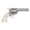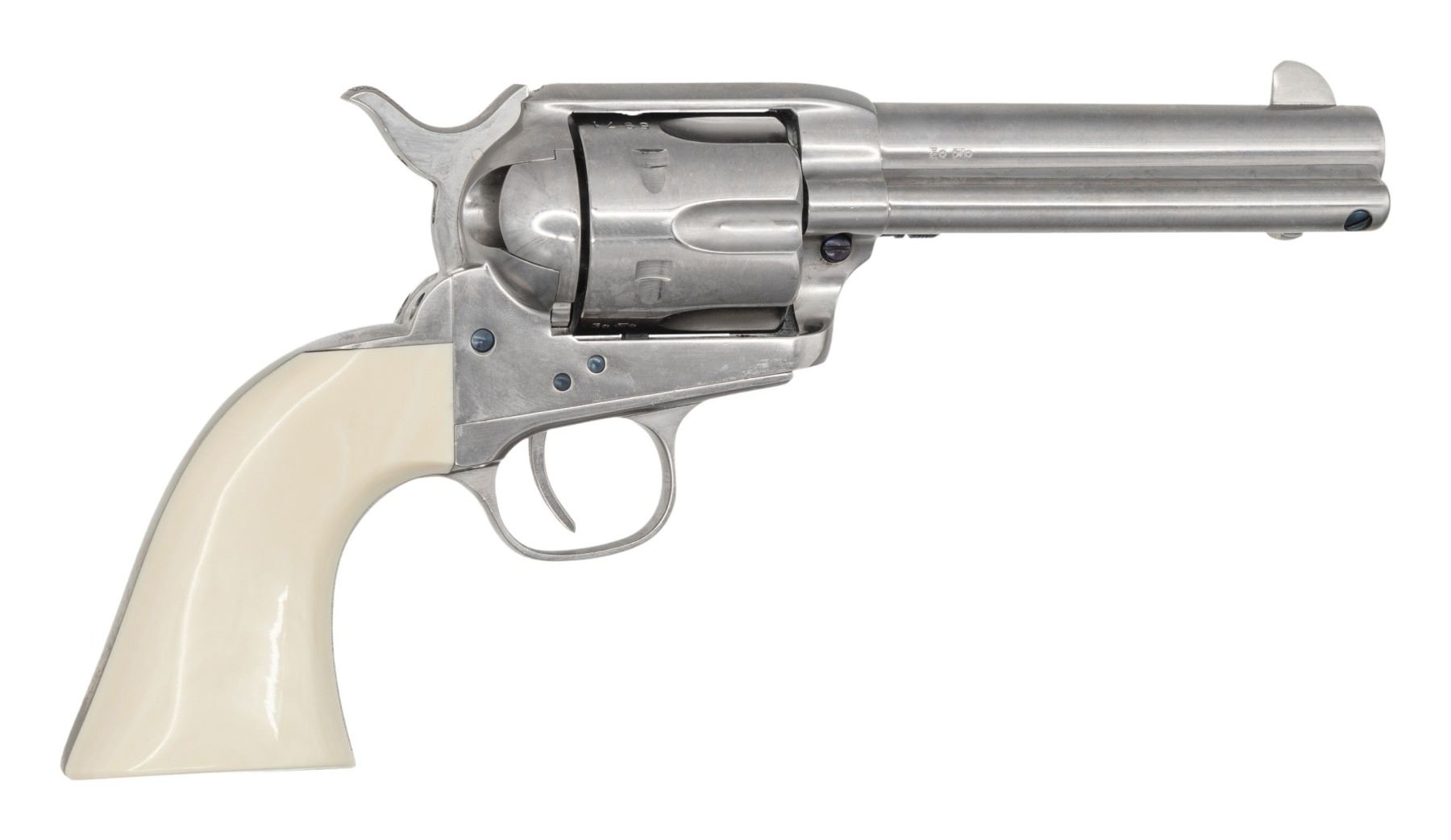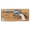 Cal. 45 Colt. S# J75971. Bbl. 4 3/4". Blade front sight. Fixed rear sight. Uberti 0410 Cattleman SAA style revolver. Nickel finish with fire blued small parts. Smooth white colored grips. UNATTACHED ACCESSORIES: matching numbered factory box that shows several tears, with manual. CONDITION: all aspects near excellent. (25-6209/MJC). MODERN. $700-1,000.