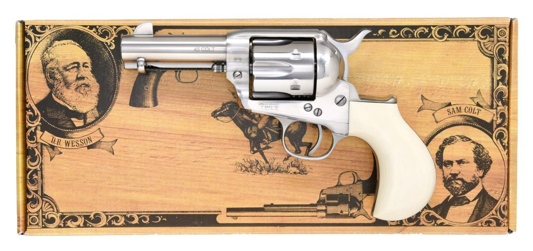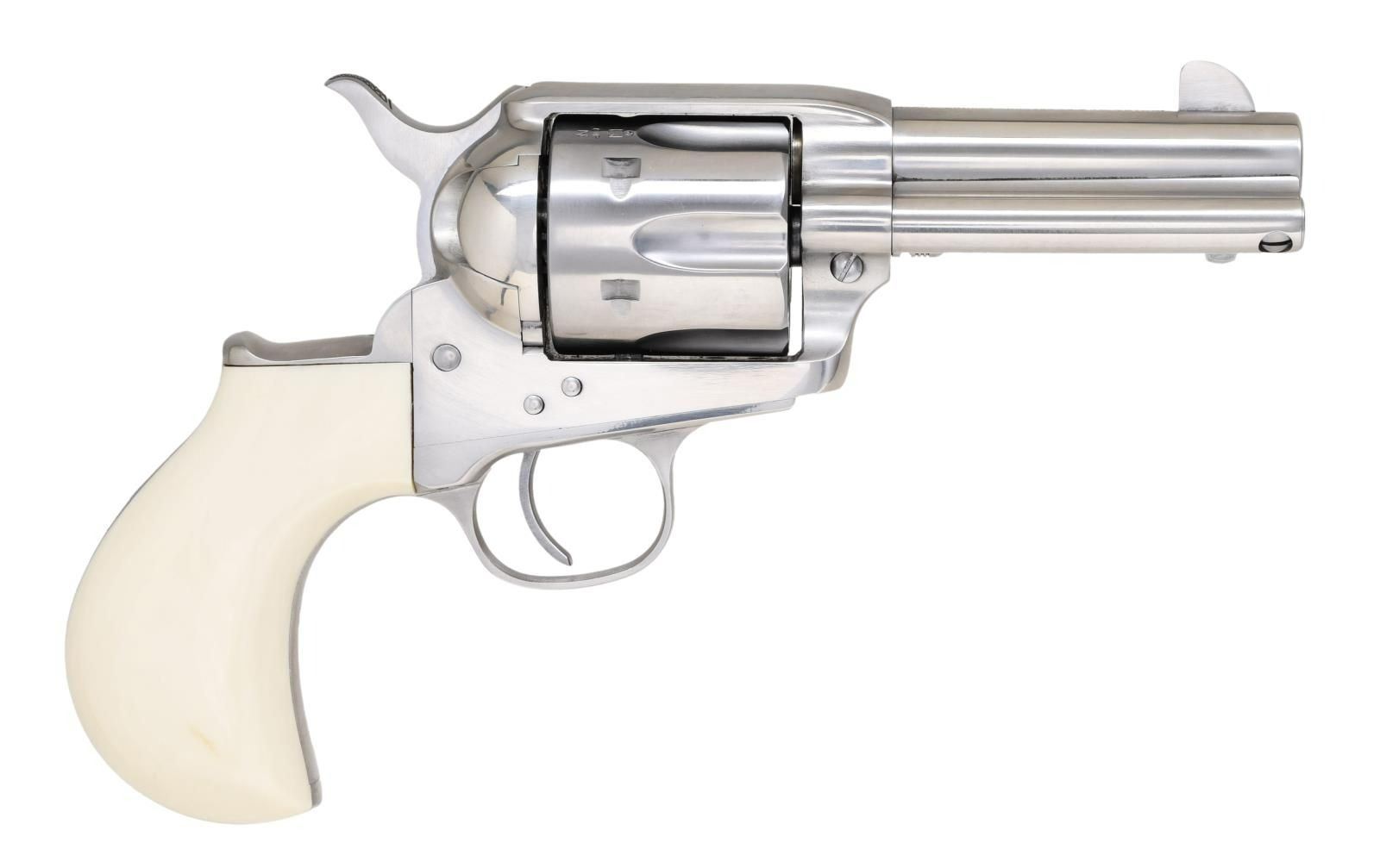 SINGLE ACTION REVOLVER. Cal. 45 Colt. S# N15374. Bbl. 3 1/2". Doc Holiday Thunderer single action revolver mfg. by Uberti in Italy and imported/retailed by Cimarron Firearms. The top of the bbl. exhibits Cimarron's importer and Uberti's mfg. information, with the cal. designation on the left. Left side of frame exhibits "patent" information. Cyl. exhibits Italian proofs. Stainless steel finish with 1 piece smooth faux ivory birds head grip. Matching numbers are present on the frame and cyl. UNATTACHED ACCESSORIES: w/box. CONDITION: excellent, with metal components retaining bountiful amounts of their original factory finish, exhibiting some scattered marks from handling and storage. Mirror bore, exhibiting a layer of factory grease and retaining well defined rifling throughout. Faux ivory grip is excellent overall. PROVENANCE: The Collection of Gun Sport Ltd owned by Jon R. Thomas. (23-4365/MLW). MODERN. $500-800.