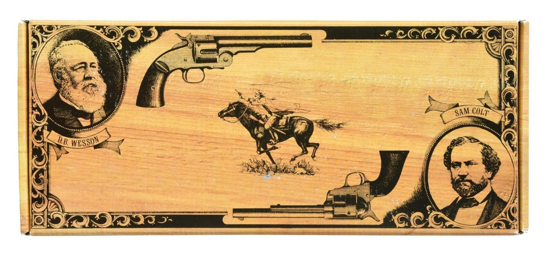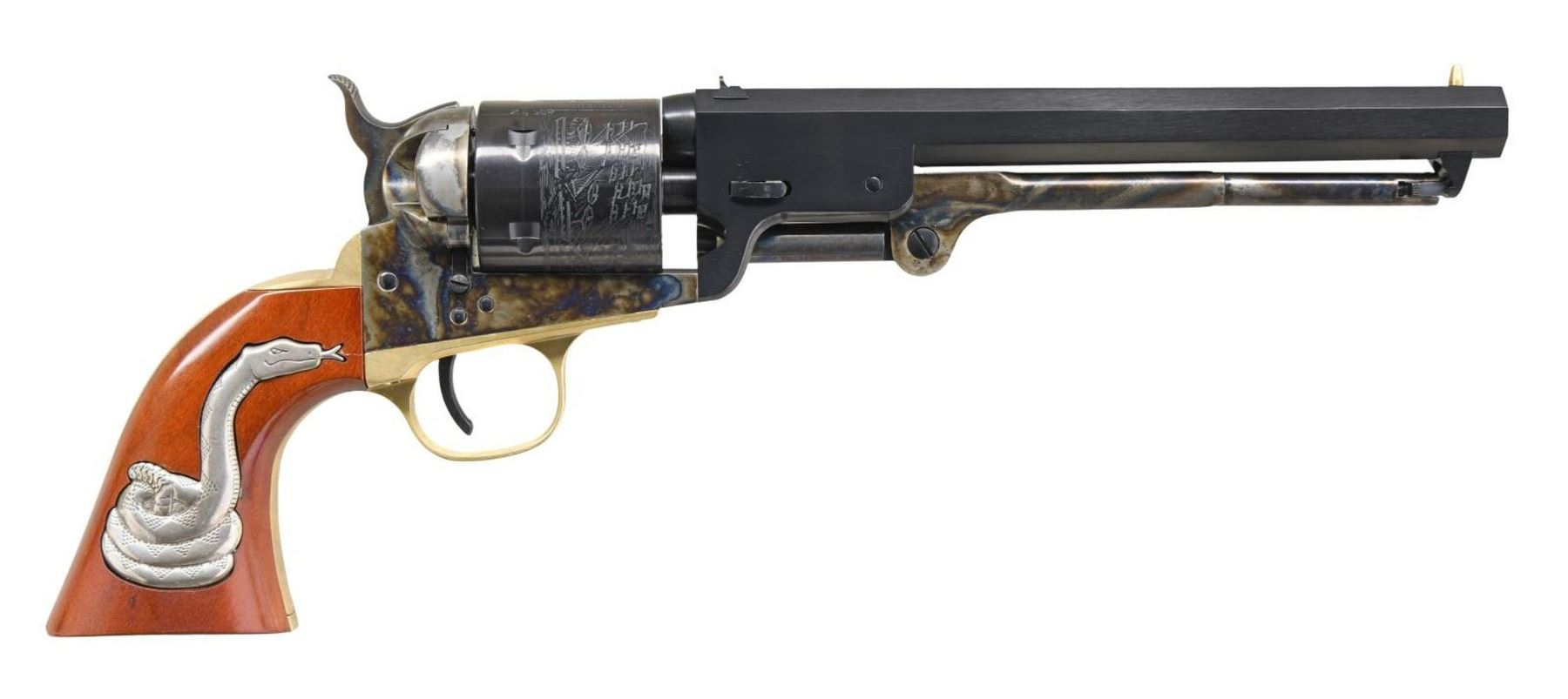 CONVERSION SINGLE ACTION REVOLVER. Cal. 38 Colt / 38 Spl. S# X61915. Bbl. 7 1/2" Model 1851 Navy cartridge conversion "Man With No Name" revolver mfg. by Uberti in Italy and imported by Cimarron Firearms. The top flat of the octagonal bbl. exhibits Cimarron's importer and Uberti's mfg. information, with the cal. designation on the underside. Left side of frame exhibits "patent" information. Cyl. features an engraved naval scene. Case color hardened frame and hammer, and loading lever, with blued cyl. and bbl. Brass grip strap and trigger guard. Smooth wood grip with signature the Man With No Name rattlesnake on right side. Brass front sight with dovetailed square notch rear sight. UNATTACHED ACCESSORIES: w/box. CONDITION: near new, with metal components retaining virtually all of their original factory finishes overall. Mirror bore, exhibiting well defined rifling throughout. Grip is excellent. PROVENANCE: The Collection of Gun Sport Ltd owned by Jon R. Thomas. (23-4371/MLW). MODERN. $300-500.