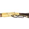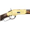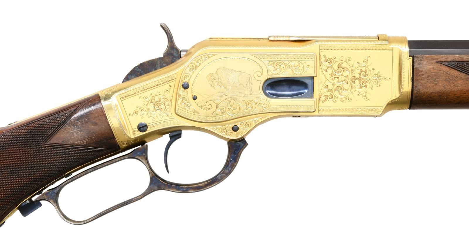 ACTION RIFLE. Cal. 44 WCF (44-40). S# 51145. Built by Uberti in Italy as 1 of 2 firing prototypes of the Buffalo Bill model 1873 issued by Franklin Mint. The Franklin Mint limited edition was a non-firing replica ornamented & styled after this hand-engraved prototype. Bbl. 24" octagon. Sporting sights. Full length mag. Action is hand engraved in the Ulrich style featuring a vignette of Buffalo on right sideplate & Buffalo chase scene on left sideplate. Balance of receiver sides have vine type scroll engraving w/ punch dot backgrounds & fancy borders that continue to upper & lower receiver areas along w/ forearm cap & buttplate peak. Receiver, forearm cap & buttplate are gold finished. Blue bbl. & mag. tube w/ case colored hammer & lever. Forearm & ebony tipped pistol grip stock of fancy walnut have style H hand checkering. UNATTACHED ACCESSORIES: letter dated May 29, 1992 to the consignor authenticating this rare prototype, "I confirm in this letter that two prototypes of the Cody Replica were made by Uberti in Brescia, Italy. You now own one, and I own the other.". Also includes 4 piece cleaning rod held in stock compartment. CONDITION: metal retains 99% gold, blue & case colored finish. Gloss wood finish is cracking & chipping w/ age. Forearm shows shrinking w/ poor fit at action. Bright near excellent bore. PROVENANCE: The Collection of Edward Scott Meadows. (24-735/DS). MODERN. $3,000-6,000.