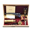 PERCUSSION REVOLVER WITH CASE & ACCESSORIES. Cal. 36. S# 252. Bbl. 7 1/2". Reproduction Colt Paterson single action percussion revolver, mfg. by Uberti in 1990. Top flat of the faceted bbl. is marked "Samuel Colt Texas Paterson", with the bottom flat marked with the Uberti logo, followed by "CAL.36 BLACK POWDER ONLY", an Italian commercial proof, and a boxed "AZ" (1990) date code. Cyl. is engraved with a stagecoach hold-up scene. Frame, cyl., bbl., and bbl. wedge exhibit a blue finish, with the hammer, rear grip strap, and several other small components exhibiting a case color hardened finish. Frame is mounted with a 1-piece smooth wood grip. German silver blade front sight, with a hammer V-notch rear sight. UNATTACHED ACCESSORIES: display case containing a capping tool, powder flask, two bullet molds, two disassembly tools, as well as a cleaning rod. CONDITION: near excellent, with metal components retaining virtually all of their original factory finishes overall. Mirror bore, exhibiting well-defined rifling throughout. Grips are excellent overall. Gunsmith attention needed, action binds & unable to cycle. Case shows some superficial marks from handling and storage but otherwise remains sturdy and serviceable. (01-25867/MLW/MD). ANTIQUE. $1,200-1,800.