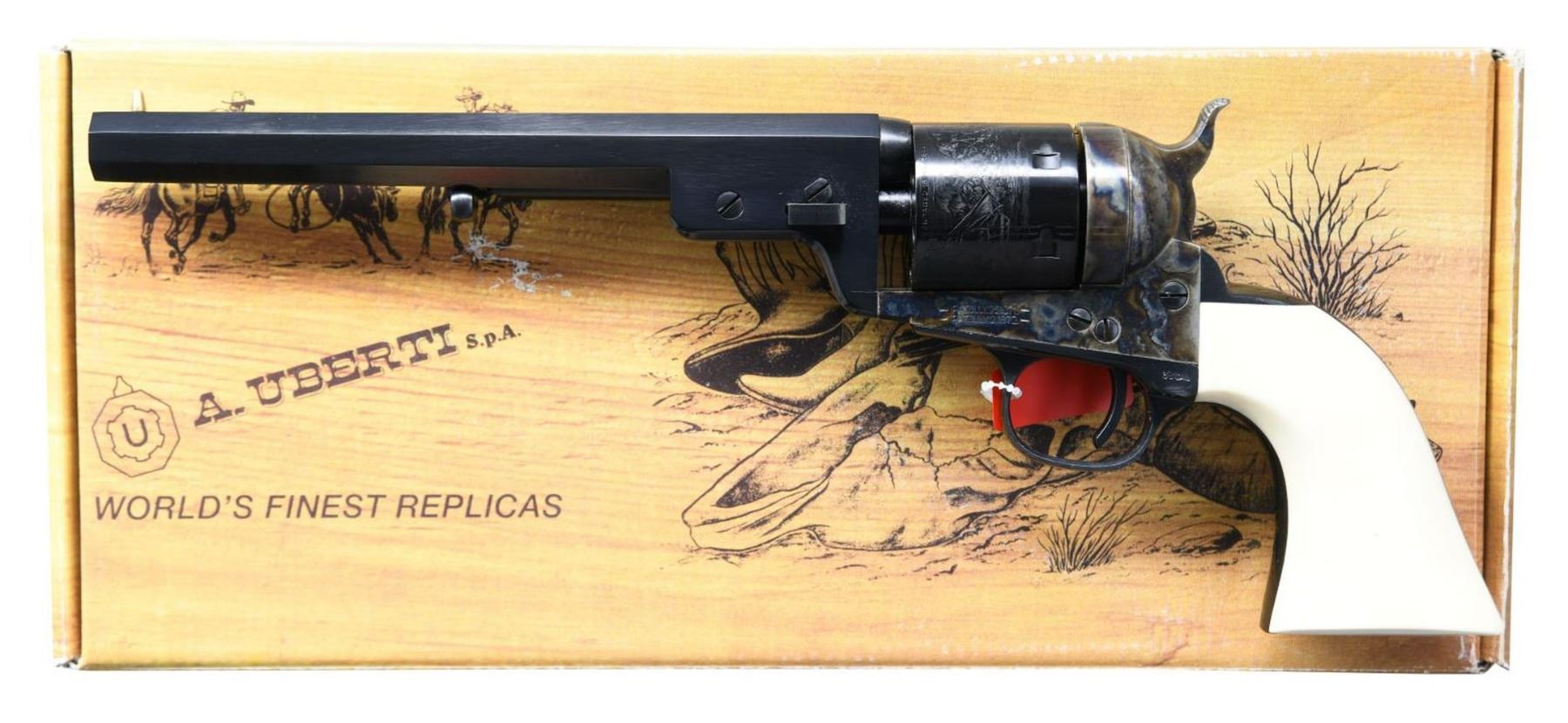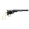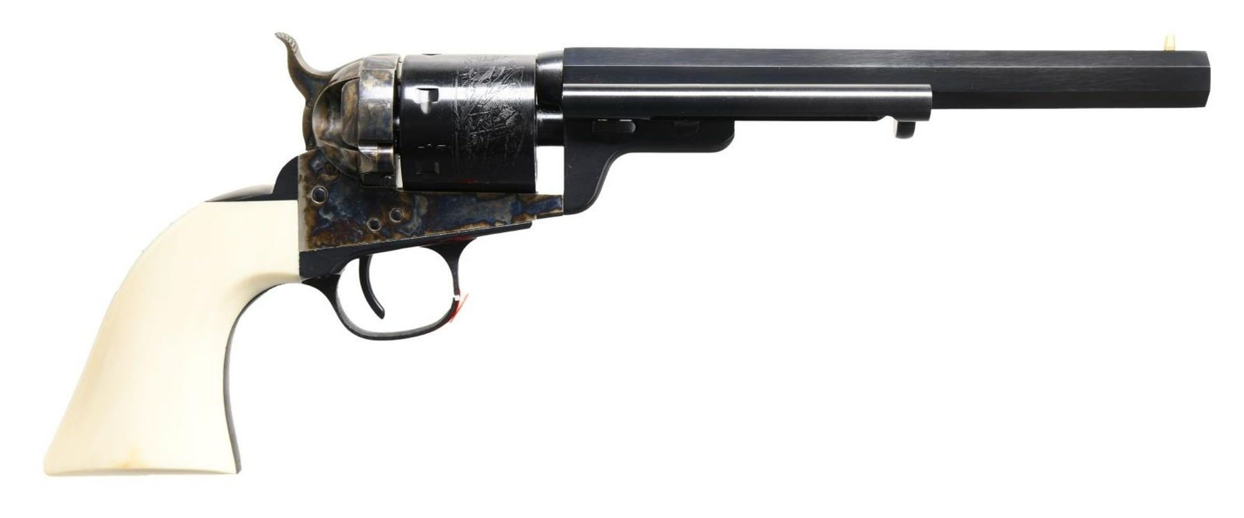 CONVERSION REVOLVER WITH MATCHING FACTORY BOX. Cal. 38 Spl. S# X66536. Bbl. 7 1/2". Model 1851 Richards-Mason Navy conversion SA revolver mfg. by Uberti in Italy and imported by Stoeger of Accokeek, MD. The top of the bbl. is marked with Stoeger's importer and Uberti's mfg. information, with the cal. designation, "1871", and Italian proofs on the underside. Left side of frame is marked with "patent" information. Cyl. is engraved with a naval scene. Case color hardened frame, loading gate, and hammer, with blued cyl., bbl., ejector rod housing, backstrap, and trigger guard. Frame is mounted with a 1 piece smooth faux ivory grip. UNATTACHED ACCESSORIES: matching factory box. CONDITION: near new, with metal components retaining virtually all of their original factory finishes overall. Mirror bore, exhibiting well defined rifling throughout. Grip is excellent. Box shows some exterior wear from storage and handling, but otherwise remains sturdy and serviceable. PROVENANCE: The Collection of Gun Sport Ltd owned by Jon R. Thomas. (23-2758/MLW). MODERN. $400-600.
