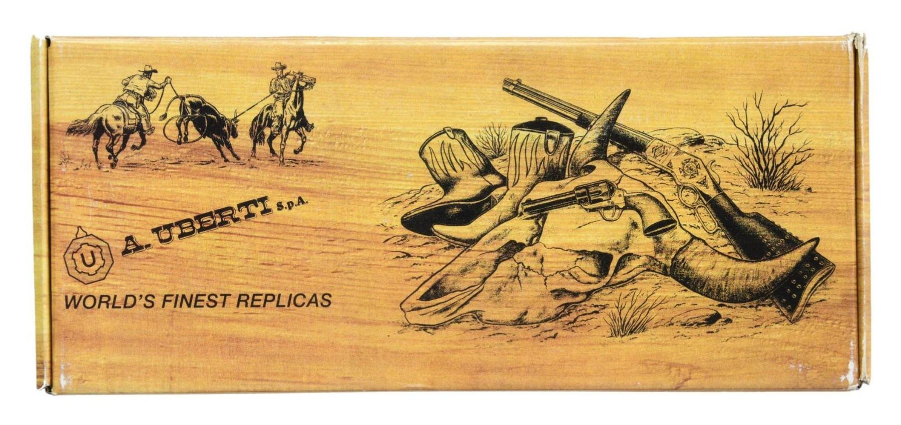 SINGLE ACTION REVOLVER. Cal. 45 Colt. S# UY8044. Bbl. 5 1/2". Model 1873 Cattleman Bisley single action revolver mfg. by Uberti in Italy and imported by Stoeger of Accokeek, MD. Left side of bbl. exhibits the model and cal. designations, with Stoeger's importer and Uberti's mfg. information across the top. Left side of frame exhibits "patent" markings. Cyl. exhibits a couple of Italian proofs. Case color hardened frame, loading gate, and hammer, with blued cyl. bbl. ejector rod housing, rear grip strap, and trigger guard. Frame is mounted with 2 piece smooth wood grips. Matching numbers are present on the frame and cyl. UNATTACHED ACCESSORIES: w/box. CONDITION: near new, with metal components retaining virtually all of their original factory finishes overall. Mirror bore, exhibiting well defined rifling throughout. Grips are very good overall. PROVENANCE: The Collection of Gun Sport Ltd owned by Jon R. Thomas. (23-4444/MLW). MODERN. $1,000-1,350.
