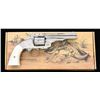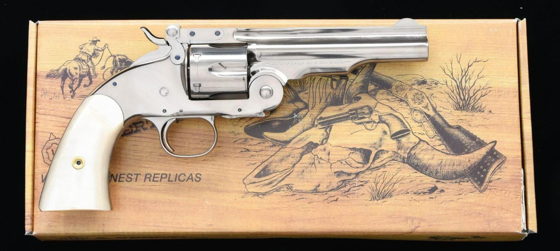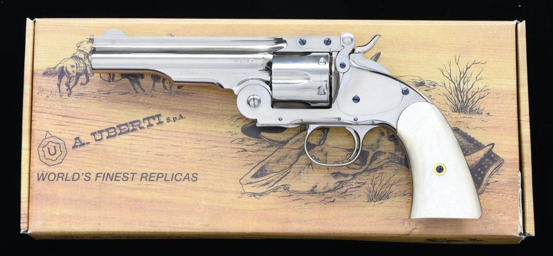 WITH MATCHING FACTORY BOX. Cal. 45 Colt. S# F22638. Bbl. 5". Schofield SA revolver mfg. by Uberti and imported by Stoeger of Accokeek, MD. The left side of the bbl. exhibits the cal. designation above "patent" information, with the right side exhibiting Stoeger's importer and Uberti's mfg. information. Italian proofs are marked on the underside of the bbl. and on the cyl. Metal components exhibit a nickel plated finish, with the frame screws and grip screw exhibiting a fire blued finish. Frame is mounted with 2 piece faux pearl grips. UNATTACHED ACCESSORIES: matching factory box. CONDITION: near new, with metal components retaining virtually all of their original factory finish overall. Cyl. bears a light dragline from cycling of the action. Mirror bore, exhibiting well defined rifling throughout. Grips are excellent. Box shows some mild exterior wear, with the lid missing its closure flaps, but otherwise remains sturdy and serviceable. PROVENANCE: The Collection of Gun Sport Ltd owned by Jon R. Thomas. (23-3995/MLW). MODERN. $800-1,200.