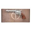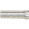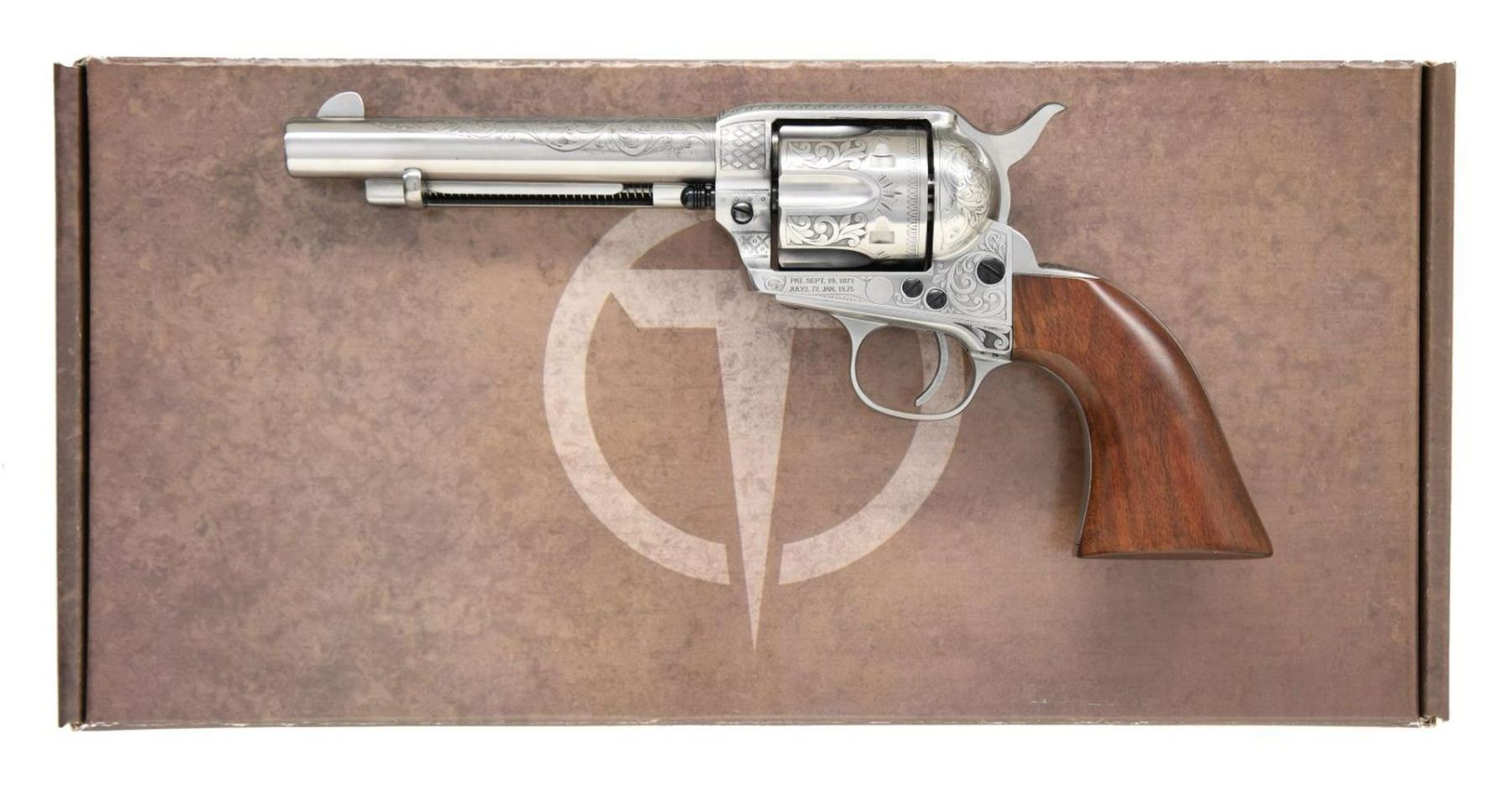 CATTLEMAN SINGLE ACTION REVOLVER. Cal. 357 Mag. S# UY0036. Bbl. 5 1/2". Model 1873 Cattleman single action revolver mfg. by Uberti in Italy and imported by Taylor's & Co. of Winchester, VA. The top of the bbl. is marked with Taylor's importer information, with the cal. designation on the left, and "A.UBERTI - ITALY" on the underside. Left side of frame is marked with "patent information". Revolver features engraving overall, exhibiting panels of scrollwork, cross hatched panels, and wavy line and dot designs. Metal components exhibit a stainless steel finish, with the cyl. base pin, base pin screw,and frame screws being blued. Frame is mounted with a 1 piece smooth wood grip. UNATTACHED ACCESSORIES: w/box. CONDITION: near new, with metal components retaining virtually all of their original factory finishes overall. Mirror bore, exhibiting well defined rifling throughout. Grip is excellent overall. PROVENANCE: The Collection of Gun Sport Ltd owned by Jon R. Thomas. (23-4338/MLW). MODERN. $700-1,000.
