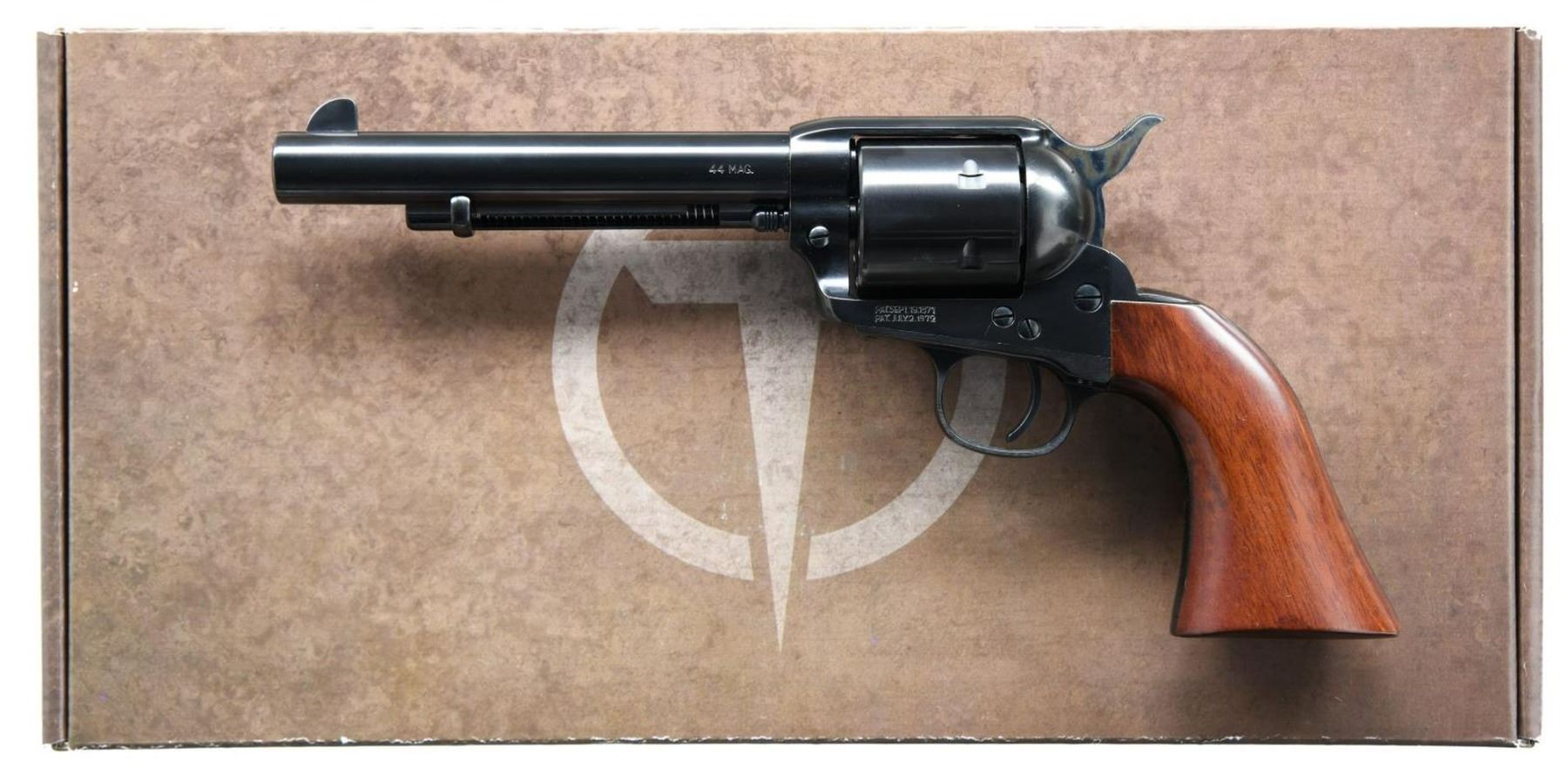 SINGLE ACTION REVOLVER. Cal. 44 Mag. S# UY1035. Bbl. 6". Model 1873 Cattleman single action revolver mfg. by Uberti & imported by Taylor's & Co. of Winchester, VA. The top of the bbl. exhibits Taylor's importer and Uberti's mfg. information, with the left side exhibiting the cal. designation. Left side of frame with "patent" markings. Metal components exhibit a blued finish, with the hammer exhibiting a case color hardened finish. Frame is mounted with a 1 piece smooth wood grip. Unfluted cyl. UNATTACHED ACCESSORIES: w/box. CONDITION: near new, with metal components retaining virtually all of their original factory finish overall. Mirror bore, exhibiting well defined rifling throughout. Grip is excellent. PROVENANCE: The Collection of Gun Sport Ltd owned by Jon R. Thomas. (23-4318/MLW). MODERN. $500-700.