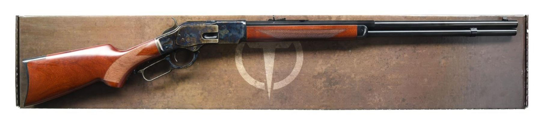 RIFLE WITH MATCHING FACTORY BOX. Cal. 44-40. S# H17236. Bbl 24 1/4". Model 1873 lever action rifle mfg. by Uberti in Italy and imported/retailed by Taylor's & Co. of Winchester, VA. The top flat of the half octagonal bbl. is marked with Taylor's importer and Uberti's mfg. information, with the cal. designation marked over the top of the breech. Top receiver tang exhibits the model designation, with "A.UBERTI - ITALY" and the S# on the bottom tang. Case color hardened receiver, lever, trigger, and bbl, with blued bbl., mag. tube, forend nose cap, and buttplate. Checkered wood pistol grip buttstock and forend. Dovetailed blade front sight with dovetailed square notch semi-buckhorn rear sight. UNATTACHED ACCESSORIES: matching Taylor's & Co. importer/retailer box. CONDITION: near new, with metal components retaining virtually all of their original factory finishes overall. Mirror bore, exhibiting well defined rifling throughout. Wood furniture is excellent and retains sharp checkering overall. Box shows some mild exterior wear, but otherwise remains sturdy and serviceable. PROVENANCE: The Collection of Gun Sport Ltd owned by Jon R. Thomas. (23-3171/MLW). MODERN. $800-1,200.