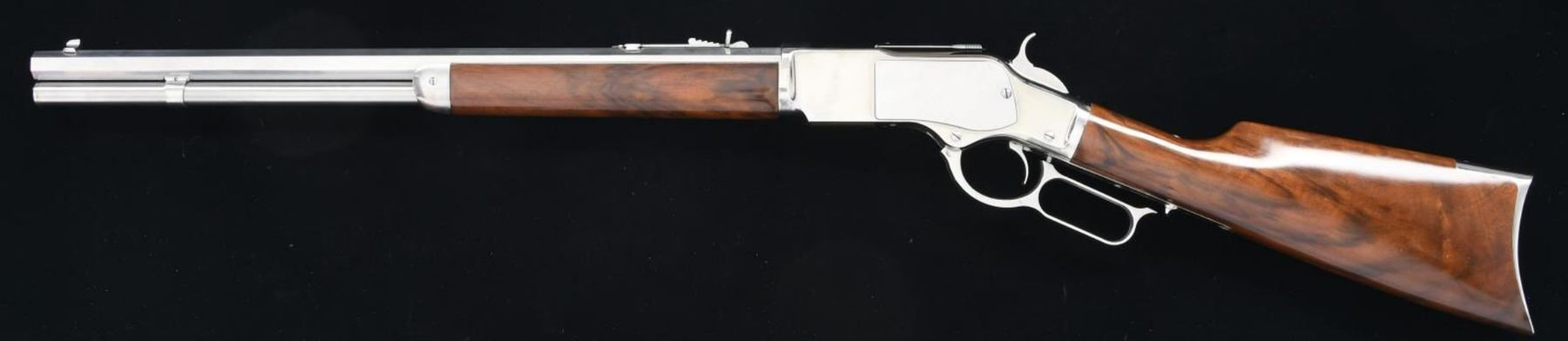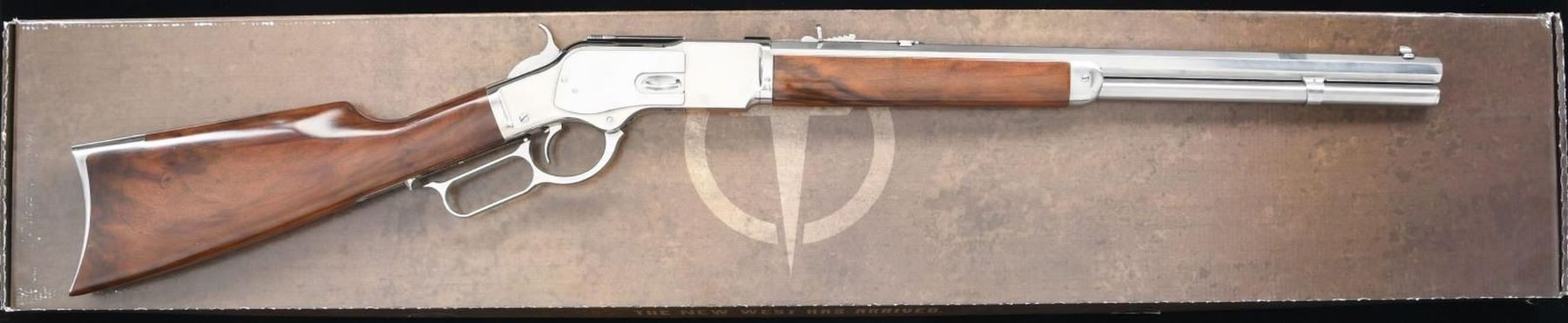 RIFLE WITH MATCHING FACTORY BOX. Cal. 357 Mag. S# H15103. Bbl. 20". Model 1873 lever action rifle mfg. by Uberti in Italy and imported/retailed by Taylor's & Co. in Winchester, VA. The top flat of the octagonal bbl. is marked with Taylor's importer and Uberti's mfg. information, with the left flat exhibiting the cal. designation "357 MAG." at the breech. Upper receiver tang is marked with the model designation, with "A. UBERTI - ITALY" and the S# on the lower tang. Metal components exhibit a polished stainless steel finish, with the straight grip buttstock and forend being comprised of white deluxe wood. Dovetailed blade front sight, with dovetailed square notch semi-buckhorn rear sight. UNATTACHED ACCESSORIES: matching Taylor's & Co. retailer box. CONDITION: very good overall, with metal components retaining bountiful amounts of their original factory finish, exhibiting areas of light surface oxidation on the sides of the receiver, lever, and bbl. Mirror bore, exhibiting well defined rifling throughout. Wood furniture shows some light superficial marks from handling and storage, but otherwise is very good overall. Box shows some mild exterior wear, but otherwise remains sturdy and serviceable. PROVENANCE: The Collection of Gun Sport Ltd owned by Jon R. Thomas. (23-3238/MLW). MODERN. $1,000-1,500.