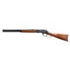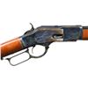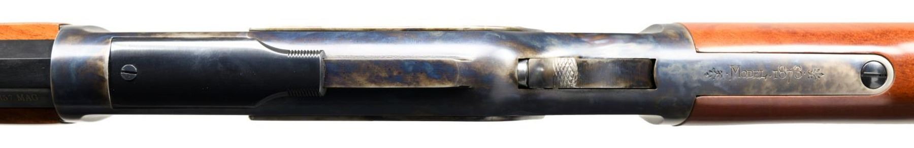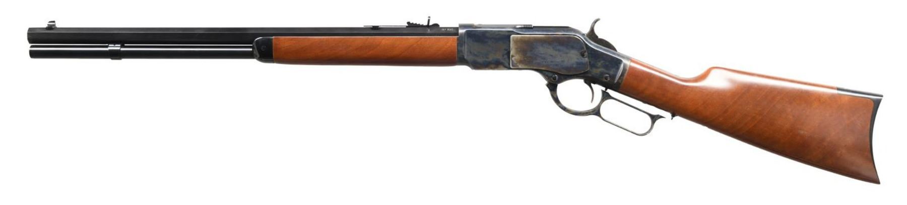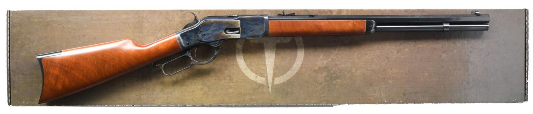 RIFLE WITH MATCHING BOX. Cal. 357 Mag. S# H13367. Bbl. 20". Model 1873 lever action rifle mfg. by Uberti in Italy and imported/retailed by Taylor's & Co. of Winchester, VA. The top flat of the octagonal bbl. is marked with Taylor's importer and Uberti's mfg. information, with left flat exhibiting the cal. designation at the breech. Upper receiver tang exhibits the model designation, with the lower tang being marked "A.UBERTI - ITALY" followed by the S#. Receiver, lever, trigger, and hammer exhibit a case color hardened finish, with the bbl., mag. tube, forend nose cap, dust cover, and buttplate being blued. Plain smooth wood straight grip buttstock and forend. Dovetailed blade front sight with dovetailed square notch semi-buckhorn rear sight. UNATTACHED ACCESSORIES: matching Taylor's & Co. importer/retailer box. CONDITION: near new, with metal components retaining virtually all of their original factory finishes overall. Mirror bore, exhibiting well defined rifling throughout. Wood furniture is excellent. Box shows some mild exterior wear from storage and handling, but otherwise remains sturdy and serviceable. PROVENANCE: The Collection of Gun Sport Ltd owned by Jon R. Thomas. (23-3219/MLW). MODERN. $800-1,200.