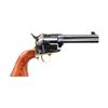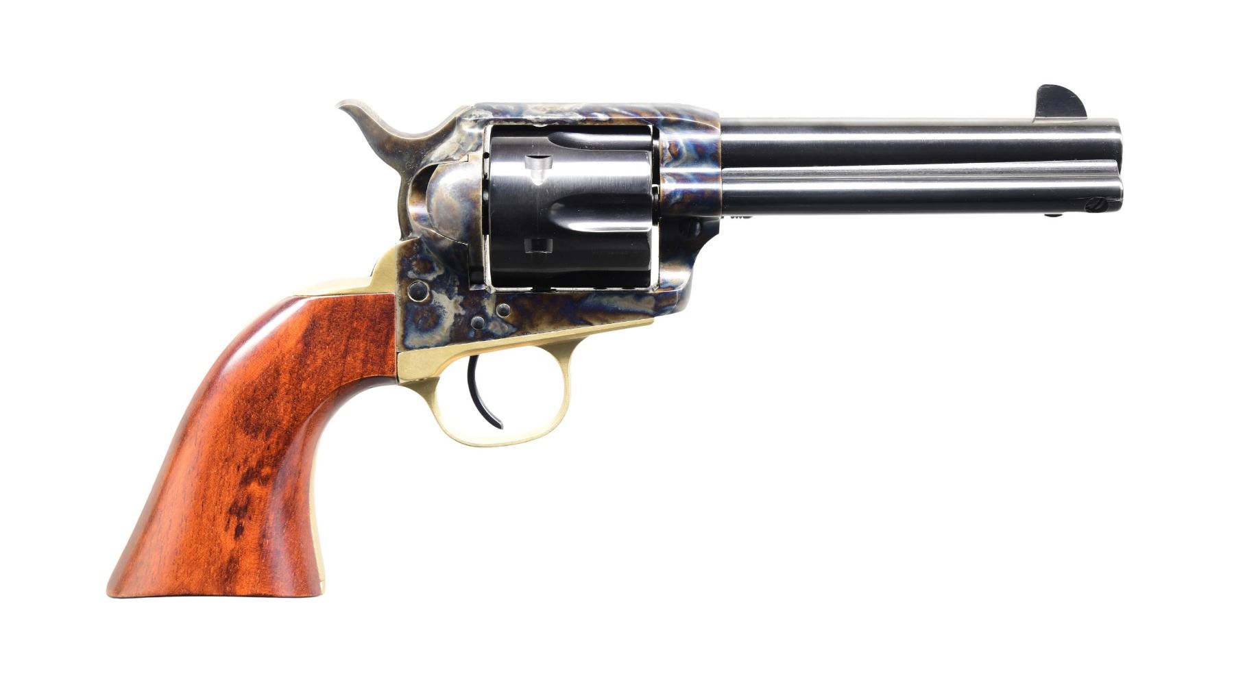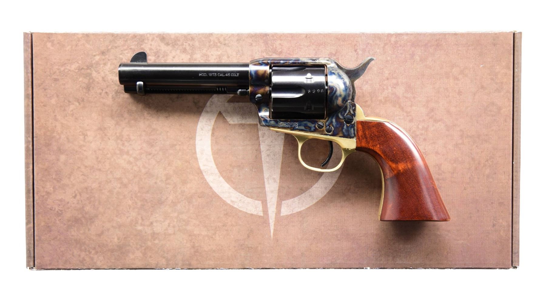 SINGLE ACTION REVOLVER WITH MATCHING BOX. Cal. 45 Colt. S# UX8296. Bbl 4 3/4". Model 1873 Ranch Hand single action revolver, mfg. in Italy by Uberti and imported/retailed by Taylor's & Co. Top of bbl. is marked with Taylor's importer and Uberti's mfg. information, with the model and cal. designation marked on the left. Left side of the frame is marked with "patent" information. Frame and hammer exhibit a case color hardened finish, with the frame screws, cyl., cyl. base pin, bbl., and ejector rod housing exhibiting a blue finish. Brass trigger guard and rear grip strap, with 1-piece smooth wood grip. Standard SAA pattern blade front sight with frame notched rear sight. UNATTACHED ACCESSORIES: matching Taylor's box. CONDITION: near new, with metal components retaining virtually all of their original factory finishes overall. Mirror bore, exhibiting well-defined rifling throughout. Grip is excellent overall. PROVENANCE: from the collection of Gun Sport Ltd., owned by Jon R. Thomas. (23-4340/MLW). MODERN. $400-600.
