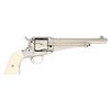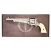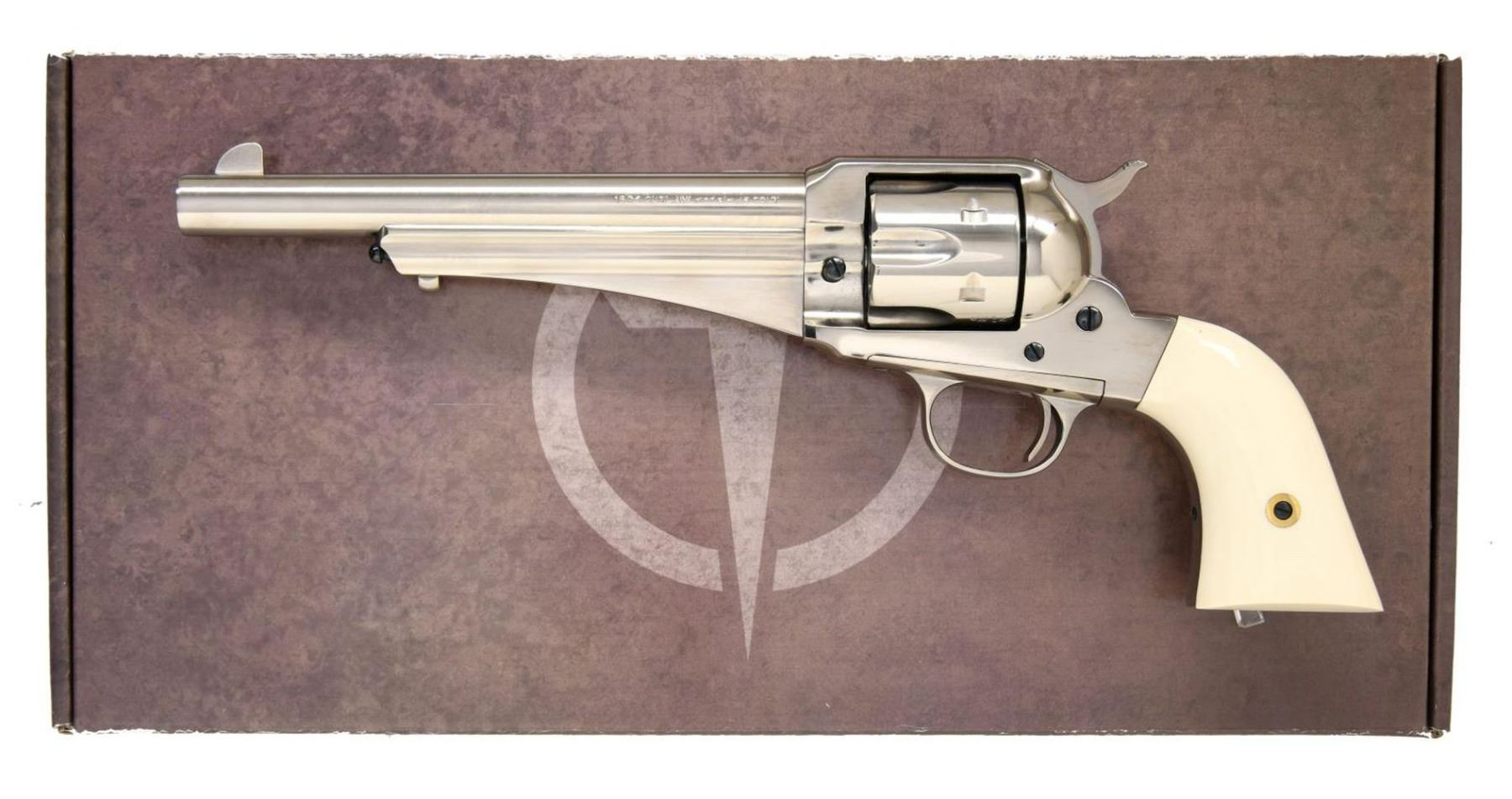 ACTION REVOLVER WITH MATCHING BOX. Cal. 45 Colt. S# UR4625. Bbl. 7 1/2". Model 1875 Outlaw SA revolver mfg. by Uberti in Italy and imported/retailed by Taylor's & Co. of Winchester, VA. Left side of bbl. is marked with the model and cal. designations, with Taylor's importer and Uberti's mfg. information marked across the top. Metal components exhibit a nickel plated finish, with the cyl. base pin, cyl. pin screw, and frame screws exhibiting a nitre blued finish. frame is mounted with 2 piece smooth white plastic grips. UNATTACHED ACCESSORIES: matching Taylor's & Co. importer/retailer box. CONDITION: near new, with metal components retaining virtually all of their original factory finish overall. Mirror bore, exhibiting well defined rifling throughout. Grips are excellent. Box shows some mild exterior wear, but otherwise remains sturdy and serviceable. PROVENANCE: The Collection of Gun Sport Ltd owned by Jon R. Thomas. (23-3881/MLW). MODERN. $500-700.
