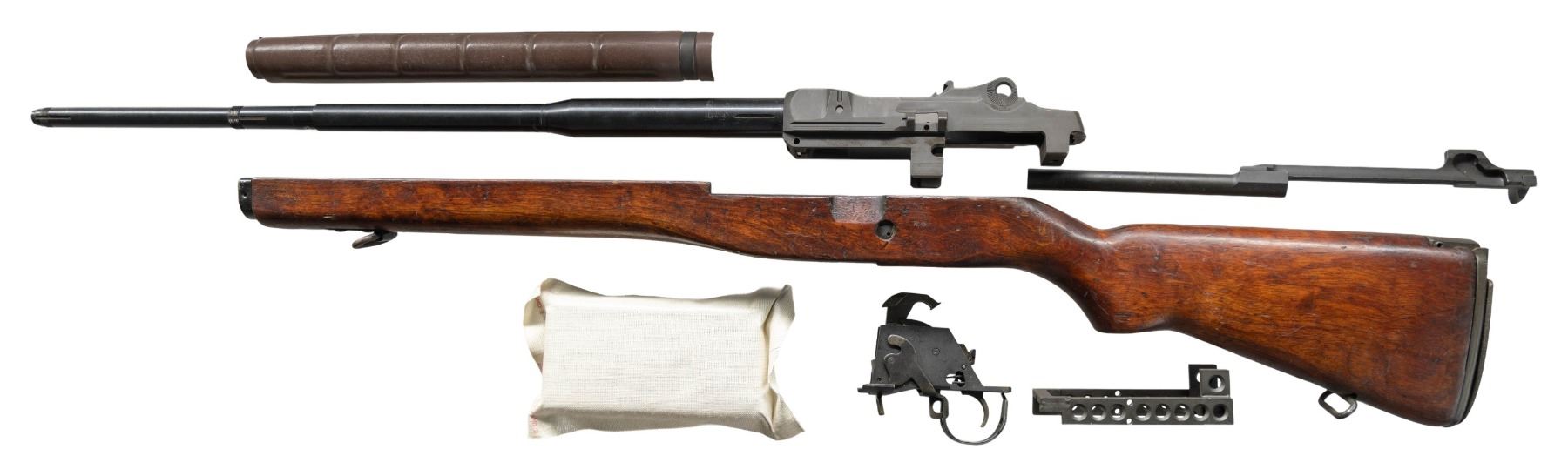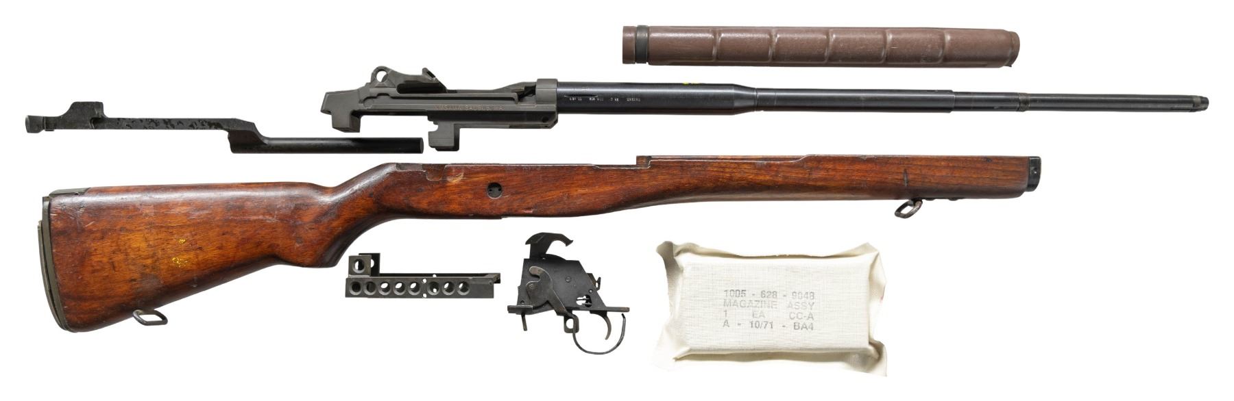 STOCK, & PARTS. Cal. 7.62mm. S# 002177. A barreled, otherwise unassembled Smith Enterprises M-21 receiver. Stamped "XM-25". Gray parkerized finish. Some lettering has been filled in white for ease of reading. Receiver has additional marking "NMSAMA, SAUGUS, MA". 22" barrel marked " 4 GR 11 / 308 WIN. / 793/ /NMSAMA / 4 35T". Surplus M14 shoulder stock. Brown plastic heat shield. "HR" marked trigger group. Op-rod. MAGS: 1 original 20 rd, still in cloth wrap, dated 10/71. CONDITION: unassembled. Some parts may be as new, while others may have been removed from prior rifles. (25-2979/JZ). MODERN. $600-$900.