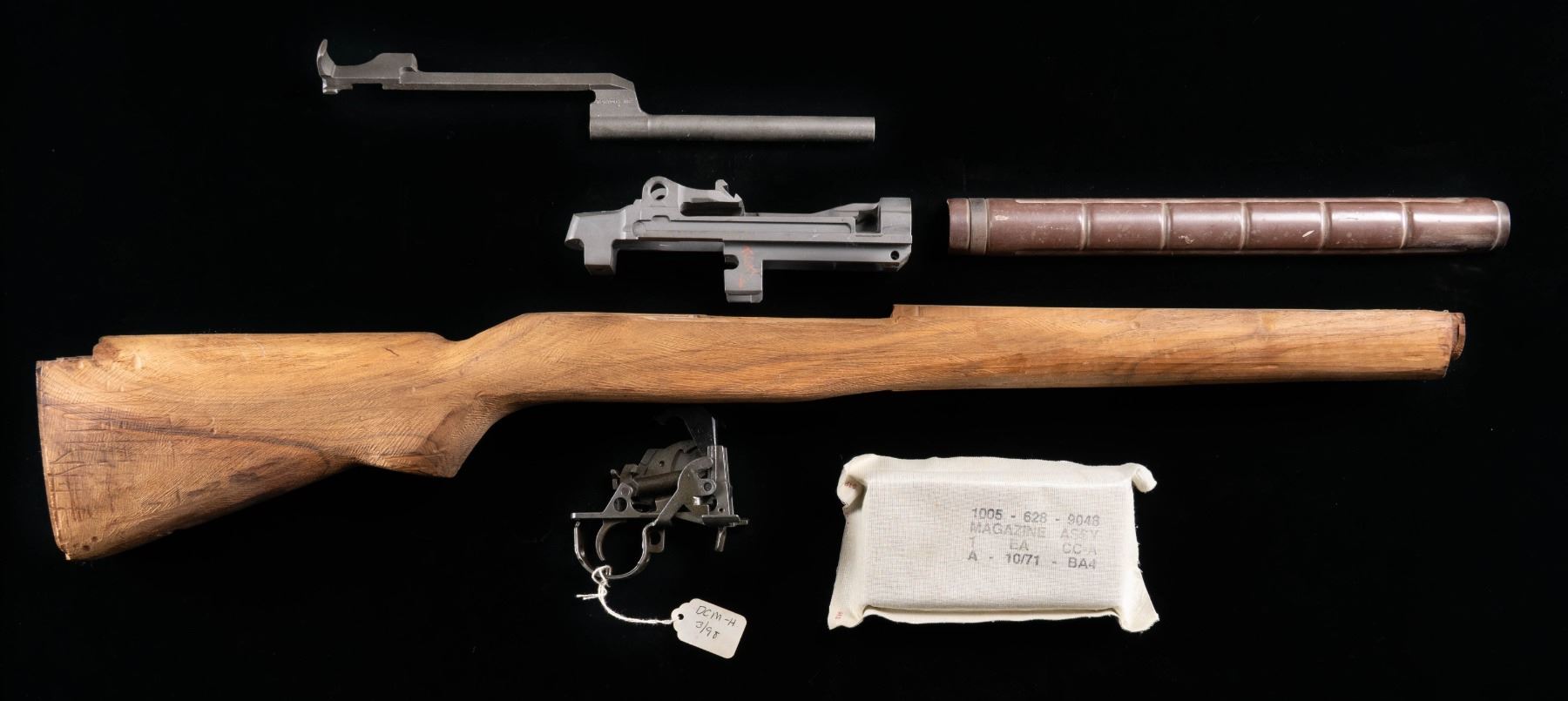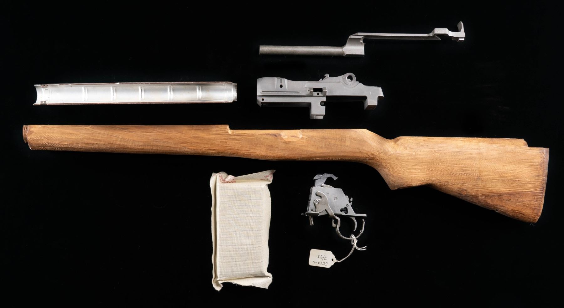 STOCK, & PARTS. Cal. 7.62mm. S# 002179. An unassembled Smith Enterprises M-21 receiver. Gray parkerized finish. Lettering has been filled in white for ease of reading. Unfinished, hardwood shoulder stock. Brown plastic heat shield. "SA" marked trigger group. Op-rod. MAGS: 1 original 20 rd, still in cloth wrap, dated 10/71. CONDITION: Unassembled. Some parts may be as new, while others may have been removed from prior rifles. (25-3042/JZ). MODERN. $600-$900.